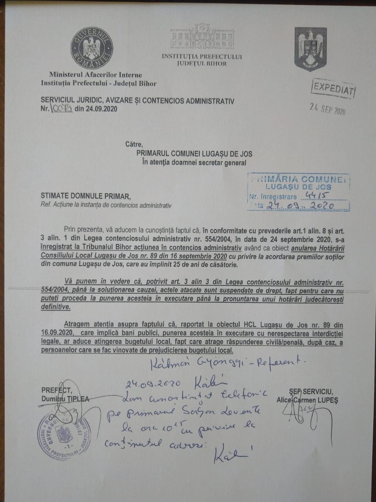 Potrivit Prefecturii, Primăria Lugaș nu a pus la dispoziție HCL, secretara fiind în concendiu de boală, iar femeia care a răspuns la telefon a transmis Prefecturii că trimite HCL-ul în 10 minute și nu a mai răspuns.