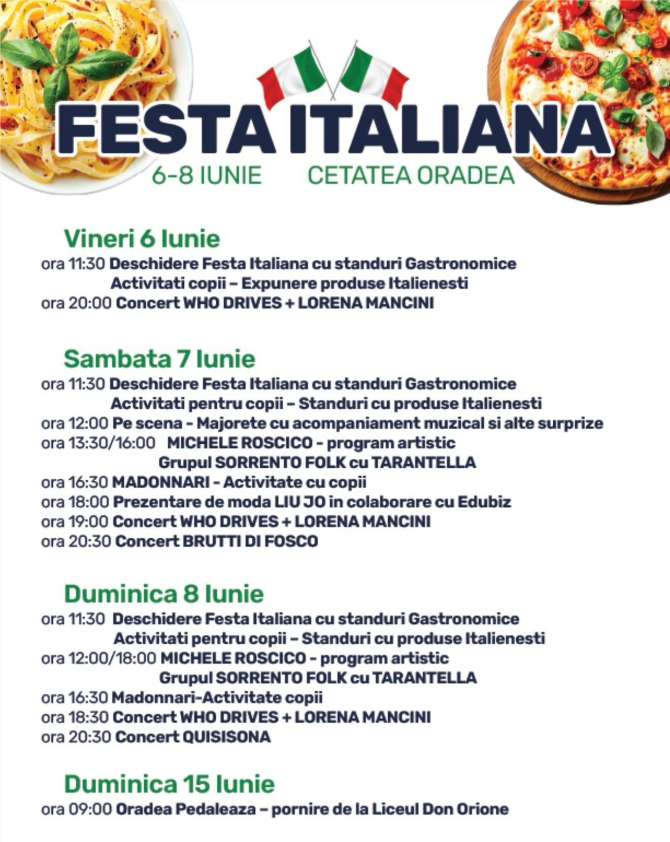 „Festa Italiana” se va deschide vineri, 6 iunie, de la ora 11:30, cu standuri gastronomice, activităţi pentru copii şi expunere de produse italieneşti. Seara, de la ora 20:00, pe scena din Cetate va avea loc concertul Who Drives şi Lorena Mancini.