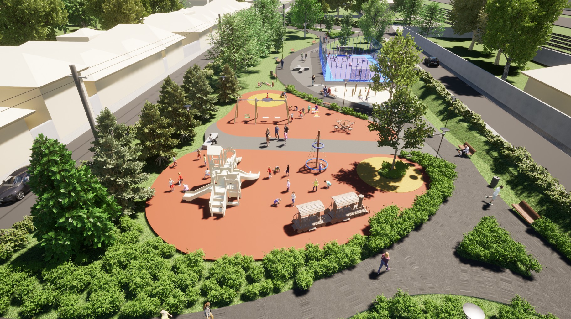Tipurile de echipamente prevăzute în proiect sunt: ansamblu cu tobogane, echipament trenuleț cu locomotivă și vagon, leagăn cu trei locuri, cățărătoare tip piramidă, carusel și ansamblu de stâlpi în zig-zag. Terenul de sport va fi unul multifuncțional (minifotbal și două panouri de baschet cu inel), fiind prevăzut cu nocturnă, împrejmuit și acoperit cu tartan.