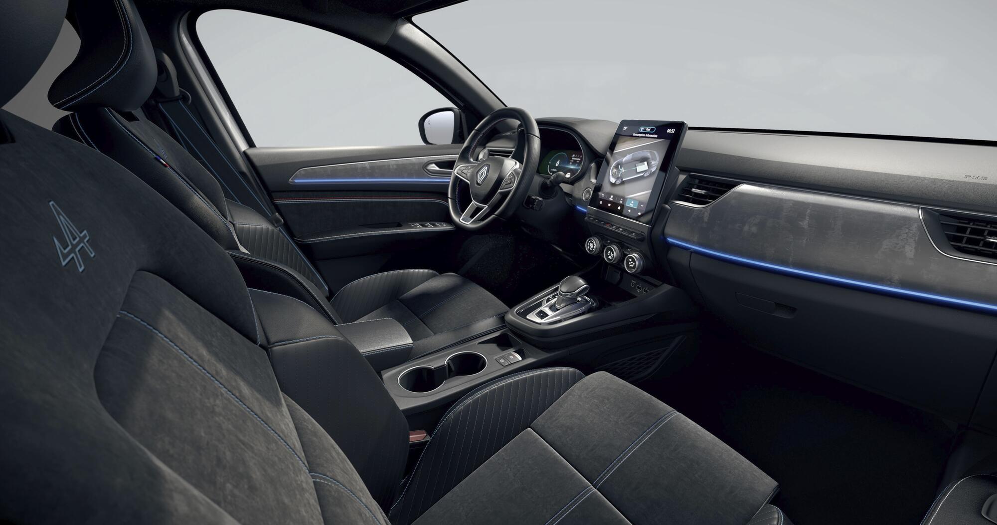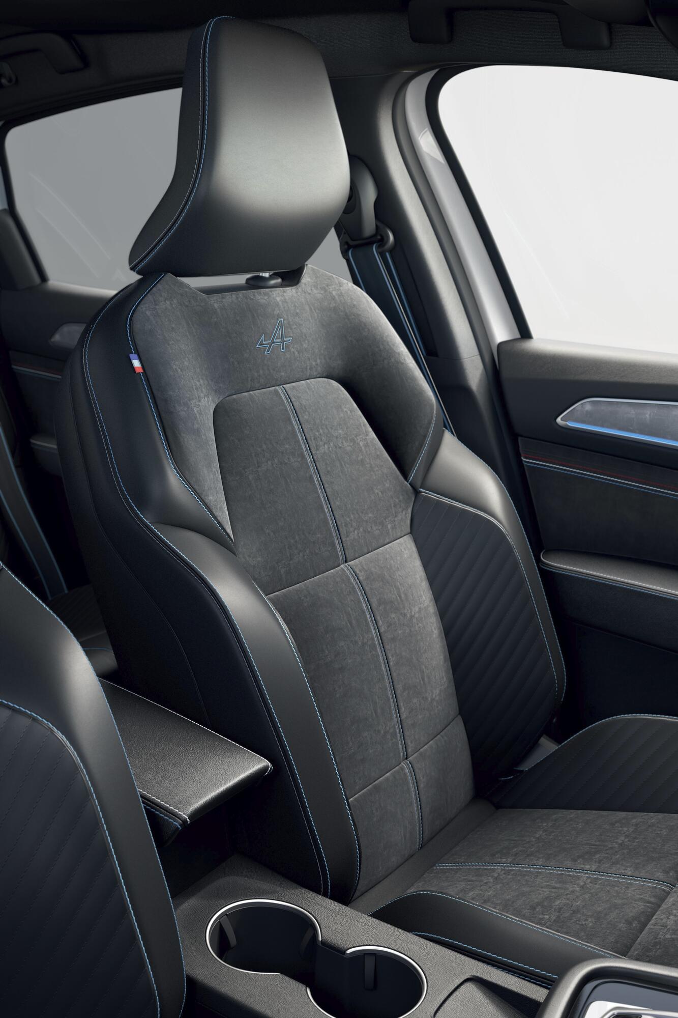 În interior, scaunele sunt prevăzute cu o tapițerie mixtă de Eco Tep (10% materiale din surse biologice) și imitație de piele întoarsă (mai mult decât în fostele versiuni R.S. Line și E-Tech Engineered). Tapițeria scaunelor are acum cusături orizontale albastre și logo-ul Alpine pe spate, iar centurile de siguranță sunt prevăzute cu două dungi albastre.