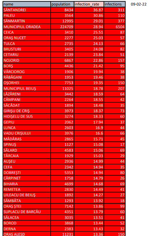Astfel, miercuri dimineața numărul cazurilor active din județul Bihor era de 3.531. Pe tot parcursul zilei precedente au fost efectuate 2.387 de teste, iar 695 dintre ele au fost pozitive.