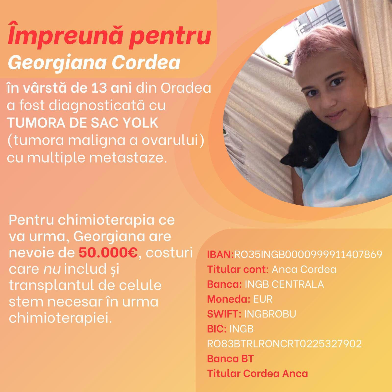 Pentru a o ajuta pe Georgiana, familia acesteia a pus la dispoziție contul bancar IBAN: RO35INGB0000999911407869, Anca Cordea