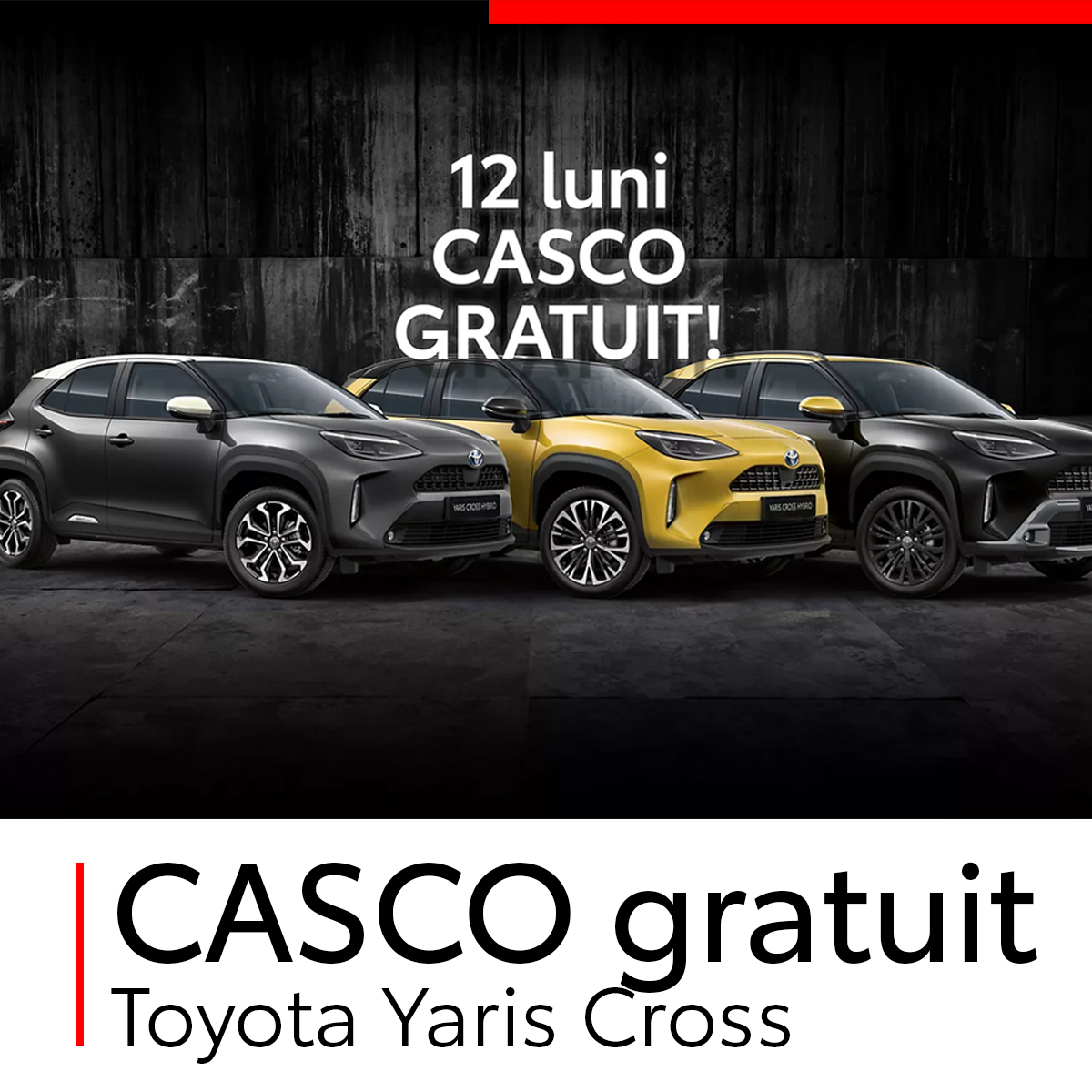 Aygo X, Toyota C-HR, Corolla Sedan benzină & hybrid, Camry Hybrid, RAV4 Hybrid și Plug-in Hybrid, Highlander Hybrid, Land Cruiser, Hilux și Proace Van toate au discount-uri atractive. Pentru contractele activate în perioada 1 octombrie – 31 decembrie 2023 pentru modelele Toyota Yaris Cross și Toyota C-HR 1.8 Hybrid beneficiezi de asigurare CASCO gratuită pentru 1 an de zile. A sosit timpul pentru o #ToyotaNOUĂ!