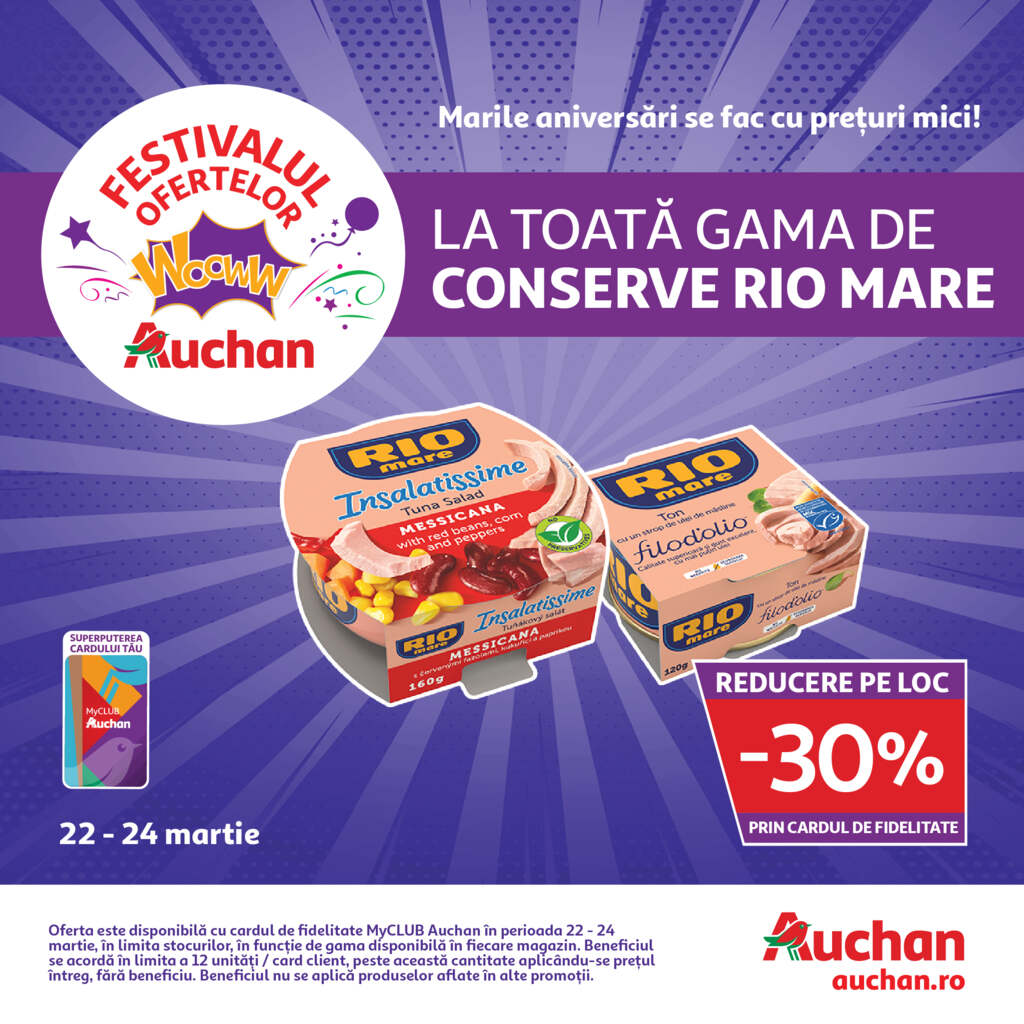 De asemenea, tot între 22 – 24 martie, ai 30% reducere pe loc cu cardul de fidelitate la toată gama de conserve Rio Mare.