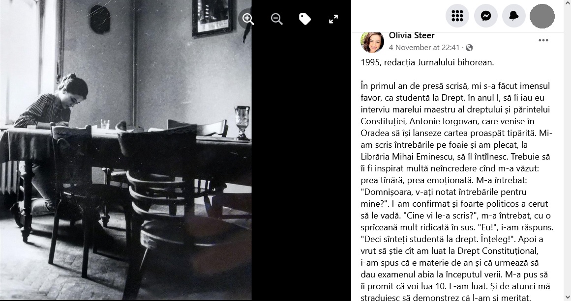 În primul an de presă scrisă mi s-a făcut imensul favor, ca studentă la Drept, în anul I, să îi iau eu interviu marelui maestru al dreptului și părintelui Constituției, Antonie Iorgovan, care venise în Oradea să își lanseze cartea proaspăt tipărită. Mi-am scris întrebările pe foaie și am plecat, la Librăria Mihai Eminescu, să îl întîlnesc. Trebuie să îi fi inspirat multă neîncredere cînd m-a văzut: prea tînără, prea emoționată. M-a întrebat: «Domnișoara, v-ați notat întrebările pentru mine?». I-am confirmat și foarte politicos a cerut să le vadă. «Cine vi le-a scris?», m-a întrebat, cu o sprîceană mult ridicată în sus. «Eu!», i-am răspuns. «Deci sînteți studentă la drept. Înțeleg!». Apoi a vrut să știe cît am luat la Drept Constituțional, i-am spus că e materie de an și că urmează să dau examenul abia la începutul verii. M-a pus să îi promit că voi lua 10. L-am luat. Și de atunci mă străduiesc să demonstrez că l-am și meritat. Noapte bună!”