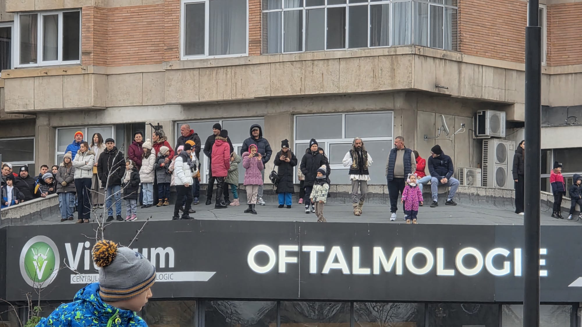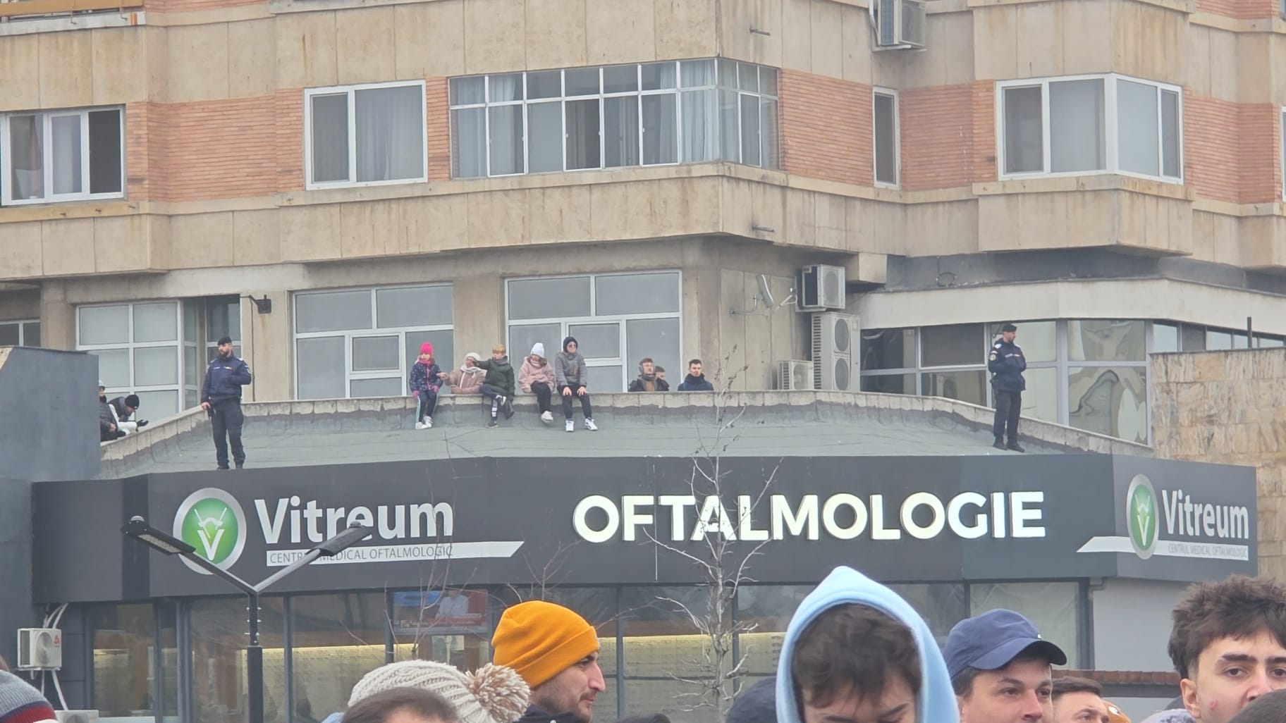 Pentru o vedere mai bună, mai multe persoane, printre care și câțiva copii au decis să se urce pe acoperișul unei clinici din apropiere. Însă, bucuria acestora nu a durat mult, aceștia fiind coborâți la scurt timp de către jandarmi.