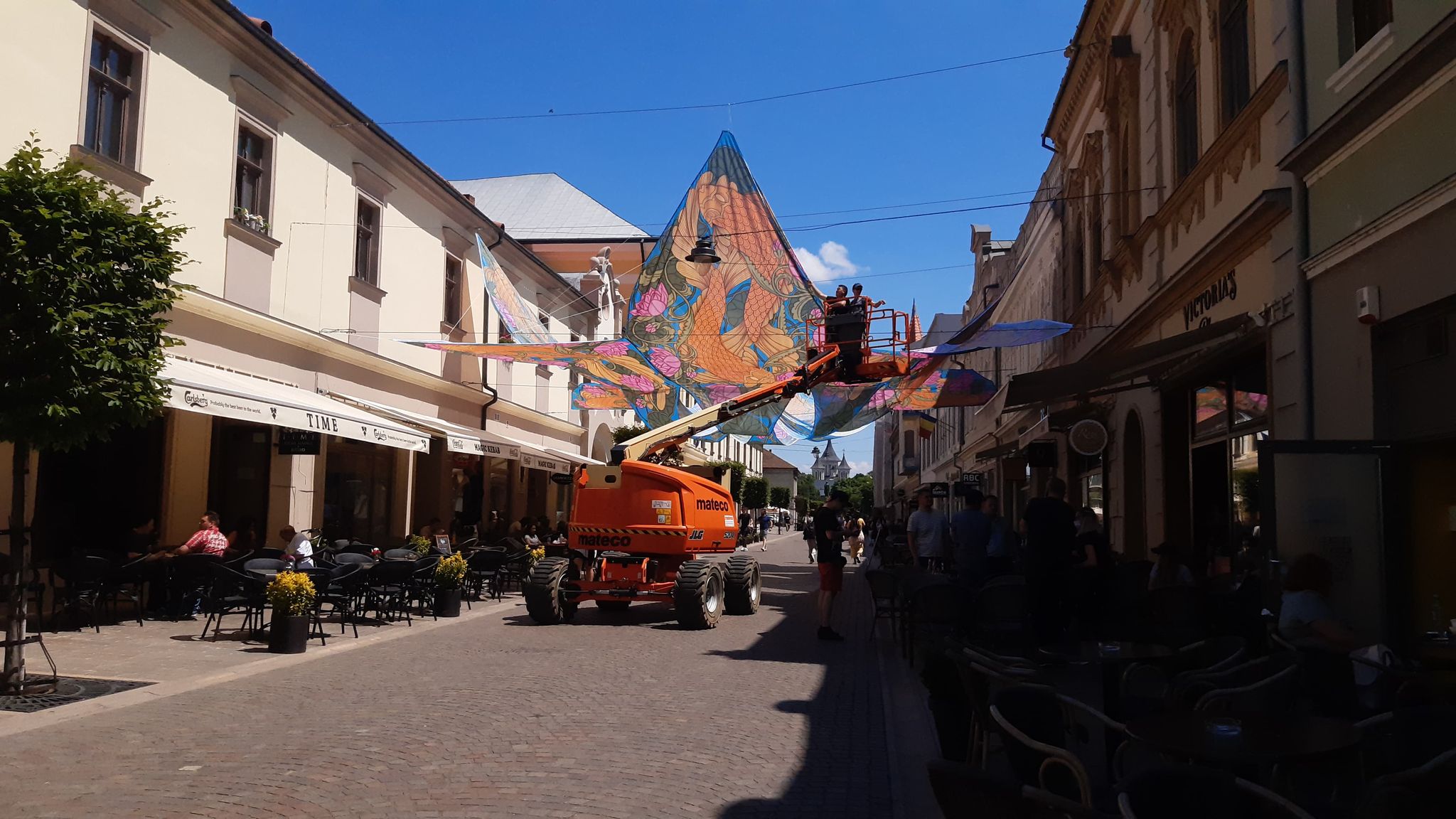 Marți se montau instalațiile 3D din pânze imprimate cu decorațiuni zoomorfe pe pietonala Alecandri și la intrarea în Pasajul Vulturul Negru.