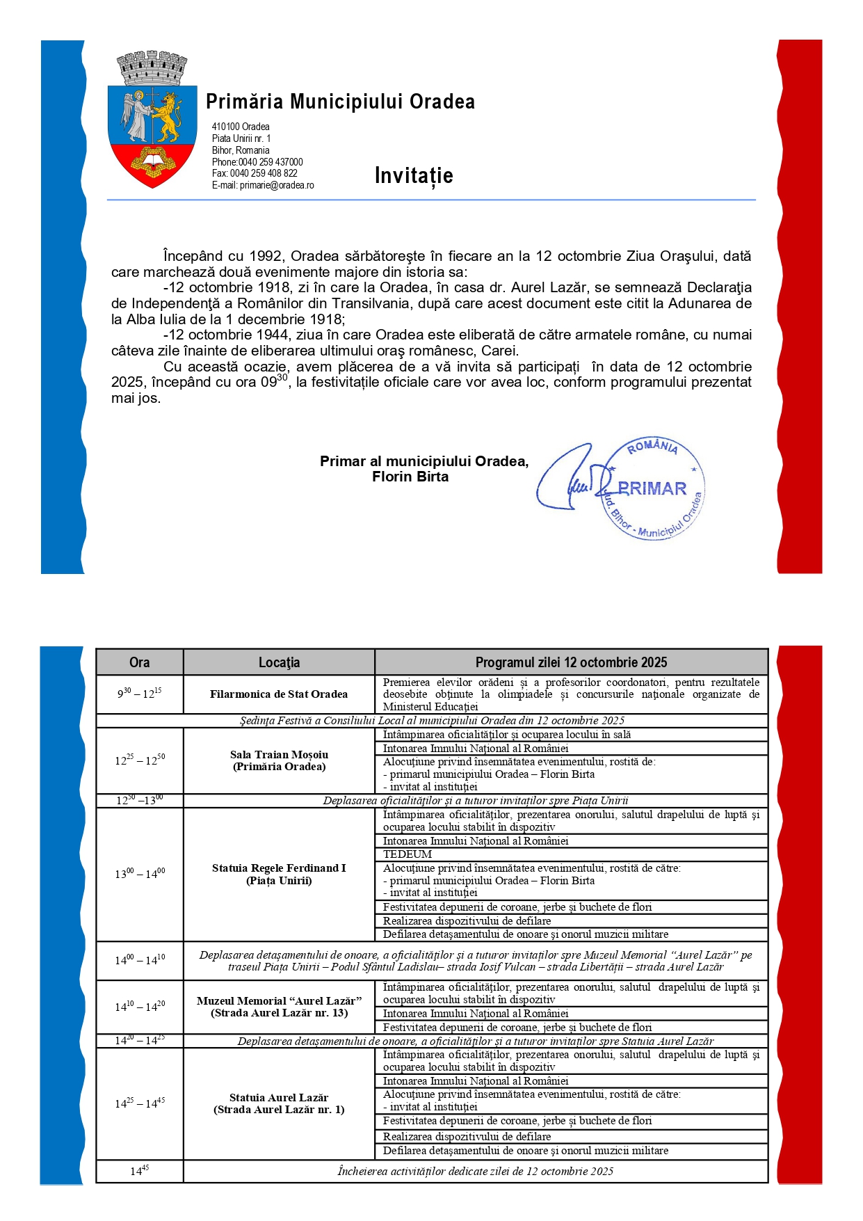 „Această dată simbolică amintește de un moment definitoriu pentru istoria orașului și este prilejul prin care comunitatea orădeană își reafirmă respectul față de valorile naționale, dar și încrederea în prezentul și viitorul său. Ziua Orașului reprezintă o celebrare a tradiției, a unității și a spiritului civic”, a transmis municipalitatea.