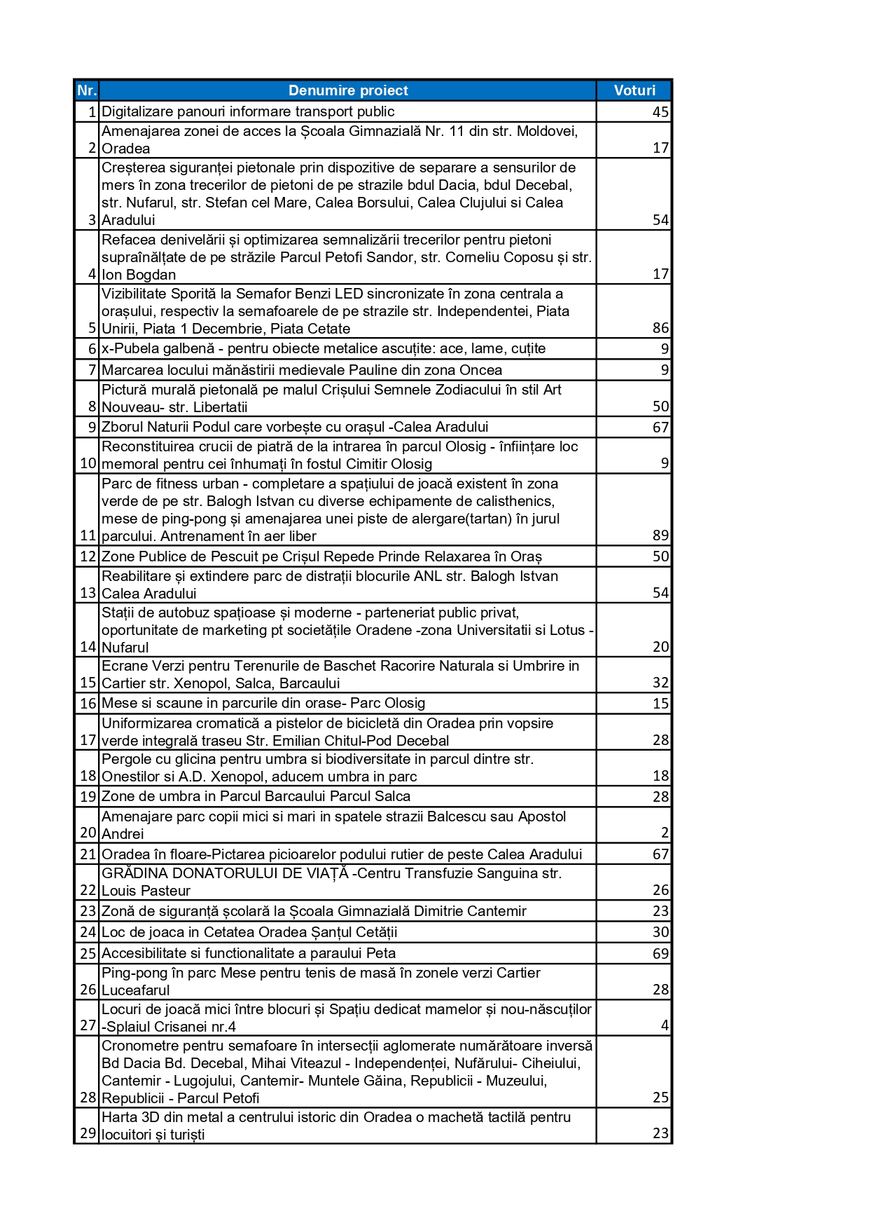 Situația numărului de voturi înregistrate de fiecare din cele 36 de proiecte până în acest moment este următoarea: