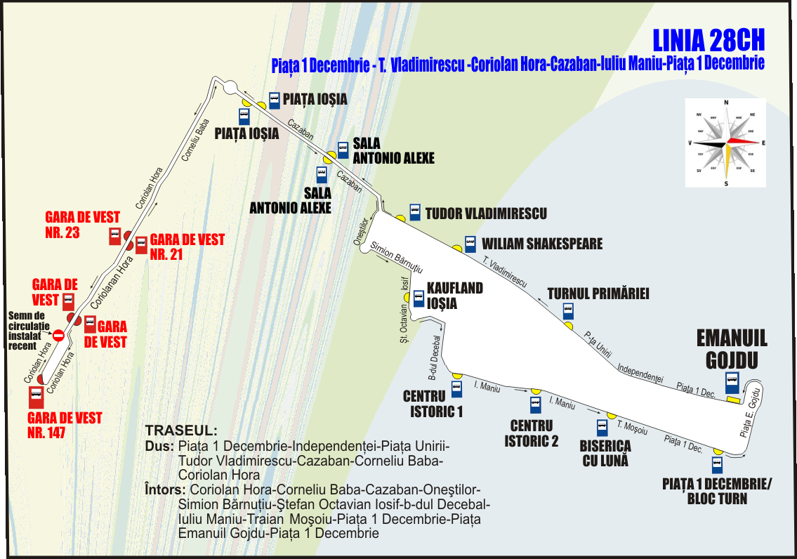 Pentru deservirea locuitorilor de pe str. Coriolan Hora şi de pe străzile învecinate, se înfiinţează linia 28CH, cu traseul conform schiţei prezentate. Pe această linie se vor efectua 3 curse/zi lucrătoare, cu plecări din staţia Emanuil Gojdu la orele 6:40, 12:30 şi 14:30, iar din staţia Gara de Vest, plecări la orele 7:05, 13:00 şi 15:00.