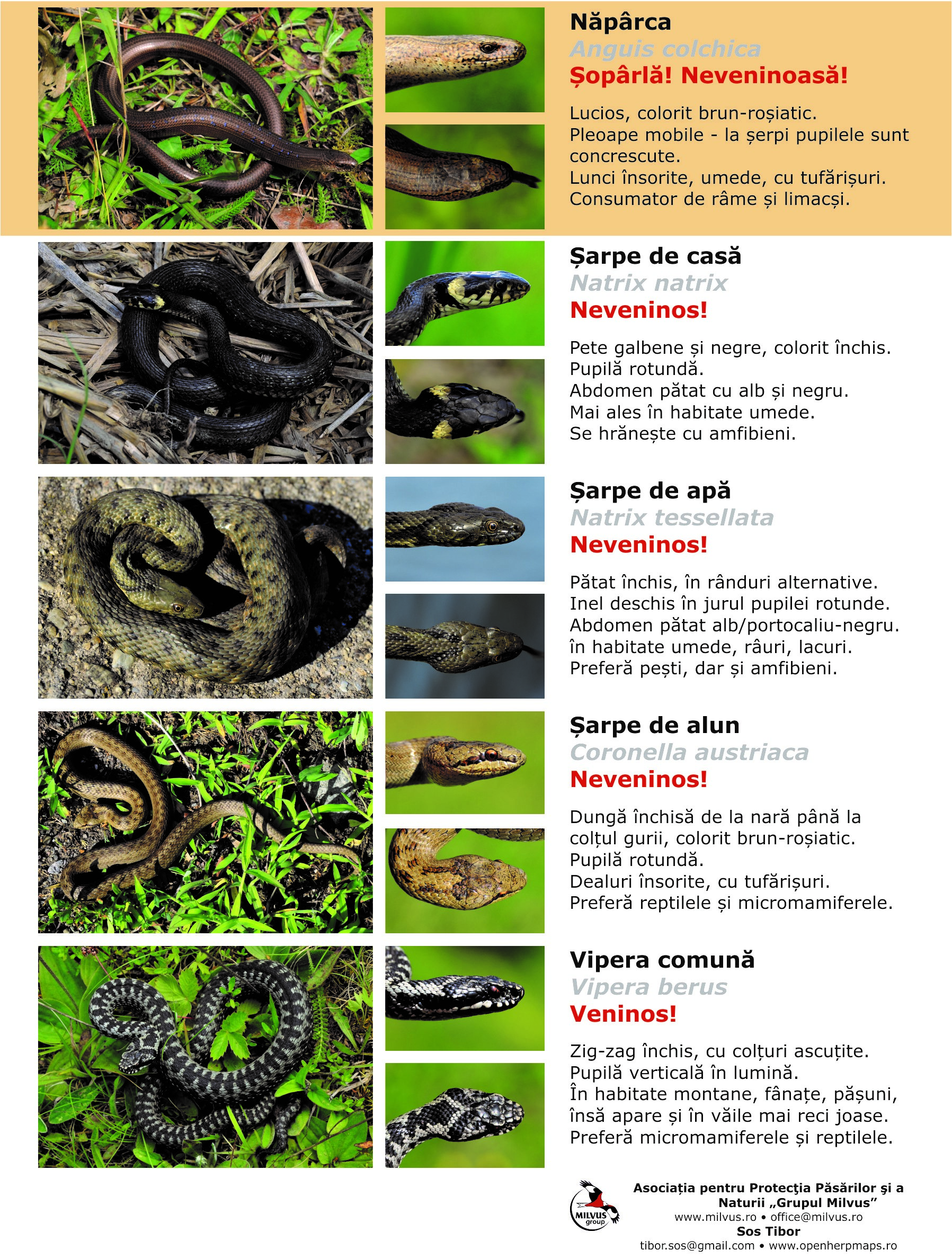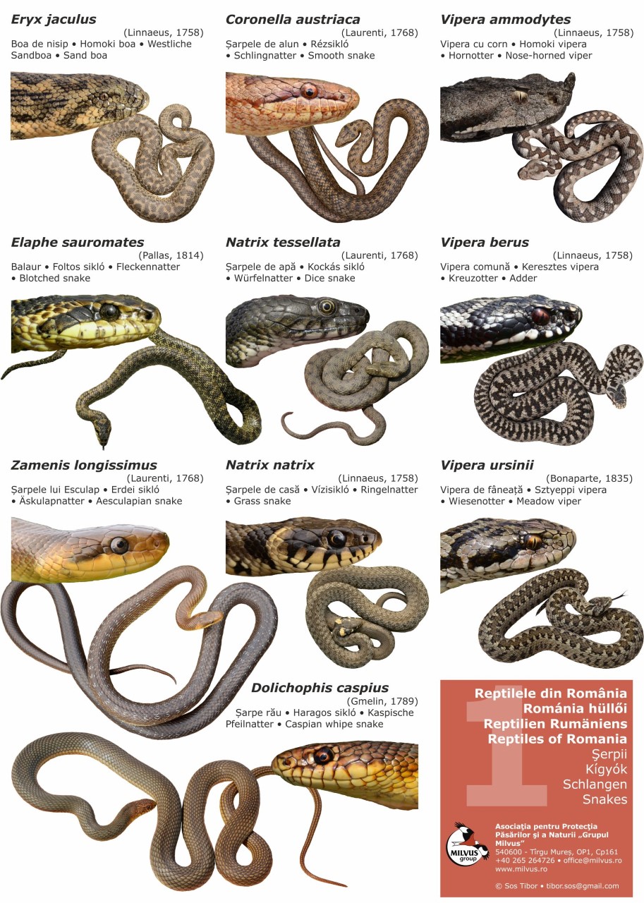 ● În afară de trei specii de viperă (vipera comună, vipera cu corn, vipera de fâneață sau de stepă) toate celelalte specii de șerpi din România sunt neveninoase.