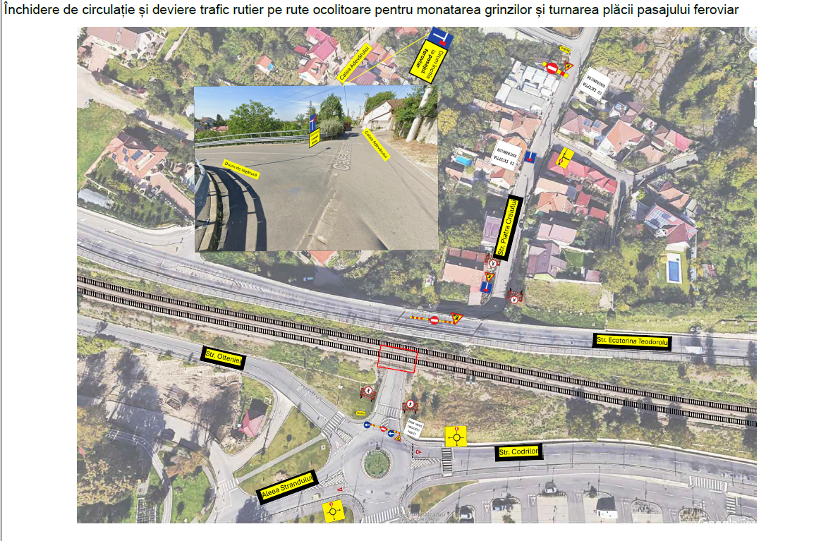 În perioada 27 martie, ora 9:00 – 28 martie, ora 17:00, circulația pe strada Piatra Craiului, pe tronsonul aflat între sensul giratoriu de la intersecția străzii Codrilor cu Aleea Ștrandului și intersecția cu Calea Adevărului va fi închisă. În acest interval se vor desfășura lucrările de montare a grinzilor pasajului.