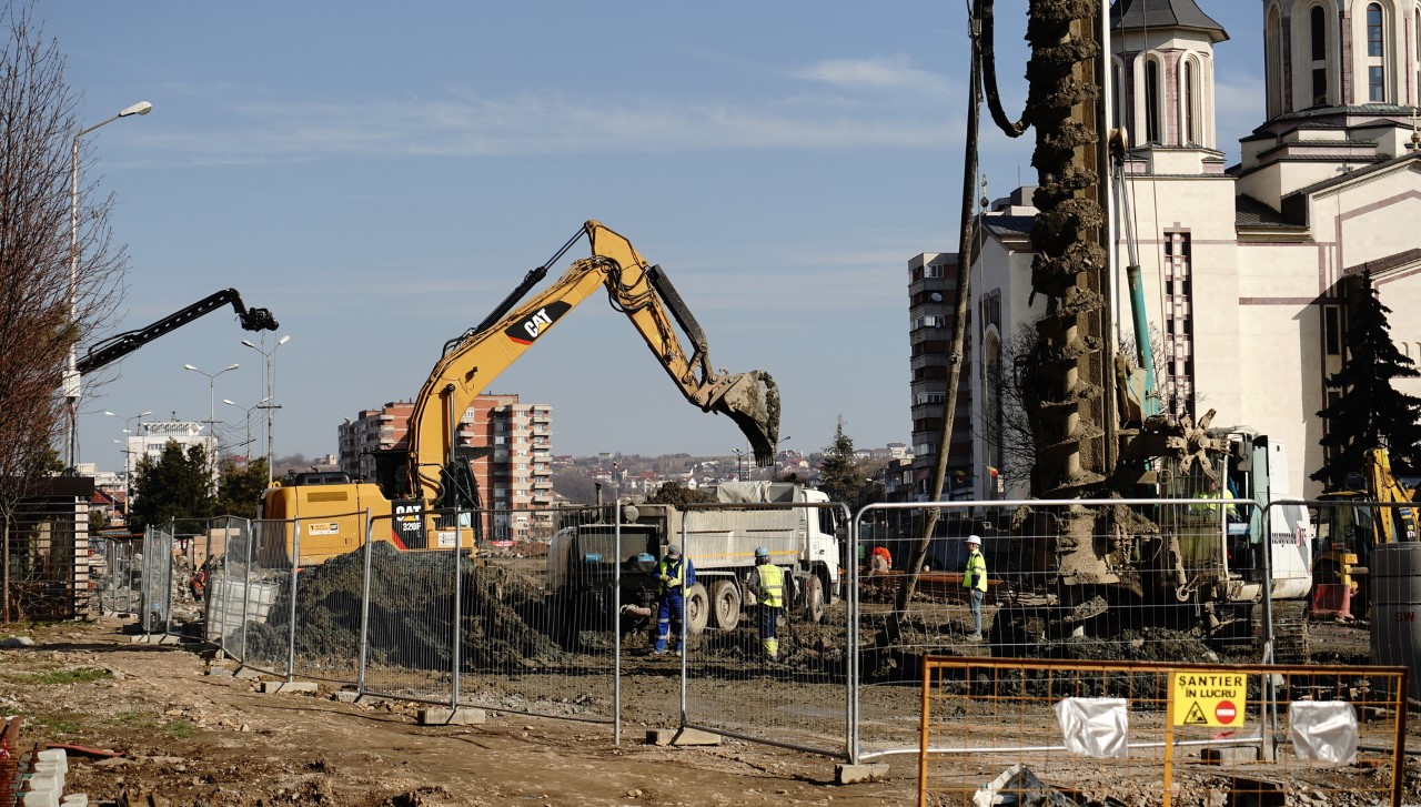 Pe șantierul pasajului rutier de la Piața Cetate stadiul de implementare al lucrărilor este la puțin peste jumătate. În partea dinspre Cantemir, structura de beton este finalizată și nu se mai vede nicio mișcare. Apa verde de la alge băltește pe fundul pasajului.