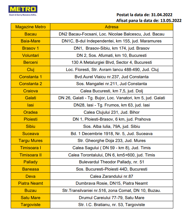 „Vă informăm că am fost notificați de către furnizorul SC Microfruits SRL să inițiem retragerea de la comercializare și de la clienți a articolului menționat mai jos. Motivul rechemării: depășire valori admise de reziduuri pesticide – Bromopropilat și Imidacloprid. În cazul în care ați cumpărat produsul menționat mai sus, vă rugăm să nu-l consumați și să-l returnați în magazinele Metro Cash & Carry România SRL până pe 13.05.2022, urmând să primiți contravaloarea lui”, anunță ANSVSA.