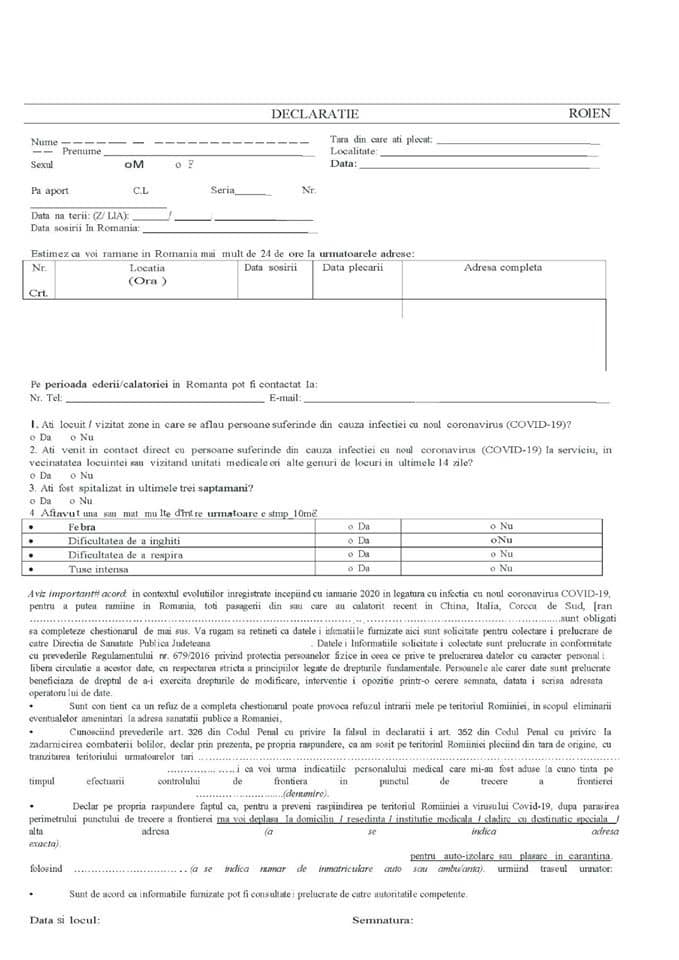 Departamentul pentru Situații de Urgență a publicat și formularul pe care cetățenii care intră în România în aceste zile trebuie să-l completeze.