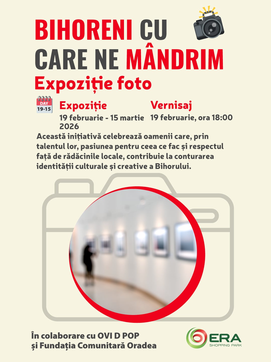 Joi, 19 februarie 2026, de la ora 18:00, sub cupola centrului comercial ERA Park Oradea, va avea loc vernisajul expoziției fotografice „Bihoreni cu care ne mândrim”, un proiect dedicat oamenilor care, prin talent, pasiune și respect față de rădăcinile locale, contribuie la conturarea identității culturale și creative a județului Bihor.