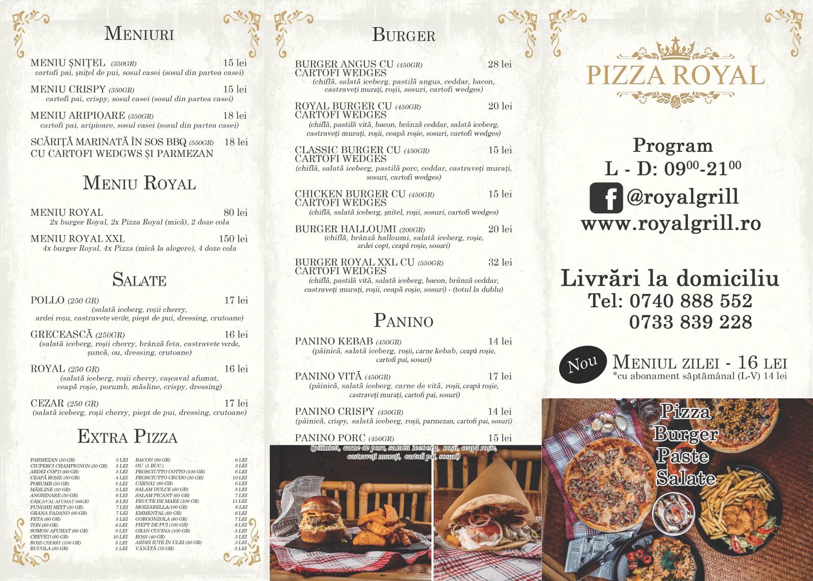 Royal Grill vă invită să vedeți mai jos și noul meniu al restaurantului, unde găsiţi multe sortimente de pizza, burgeri, paste, panino, salate, mic dejun, etc