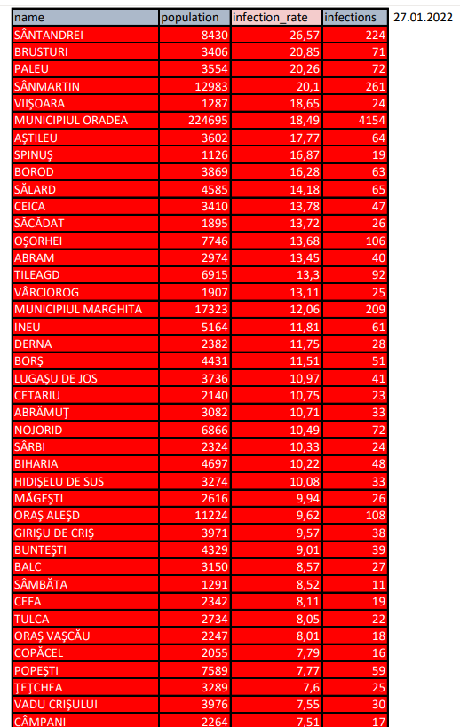 Patru localități bihorene înregistrează incidențe de peste 20 de cazuri la 1.000 de locuitor, Sântandrei fiind în continuare cu cea mai mare rată de infectare. Și Oradea se apropie de pragul de 20 de cazuri la 1.000 de locuitori, joi dimineața incidența fiind de 18,49 cazuri/1.000 locuitori.