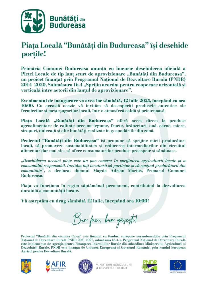 Primăria Comunei Budureasa anunță cu bucurie deschiderea oficială a Pieței Locale de tip lanț scurt de aprovizionare „Bunătăți din Budureasa”, un proiect finanțat prin Programul Național de Dezvoltare Rurală (PNDR) 2014–2020, Submăsura 16.4 „Sprijin acordat pentru cooperare orizontală și verticală între actorii din lanțul de aprovizionare”.