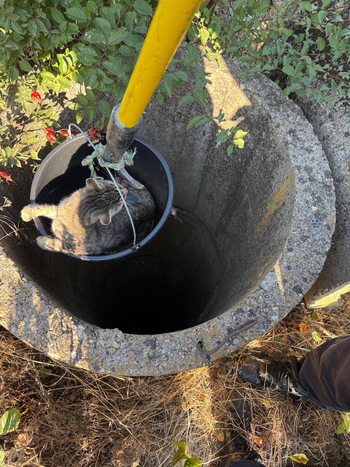 Pisica nu se afla în apă și, din fericire, nu prezenta răni vizibile. Alertați de mieunatul repetat al animalului, angajații unei firme din apropiere au sunat imediat la 112. Echipa de intervenție a folosit echipamentele autospecialei pentru a aduce pisica la suprafață.