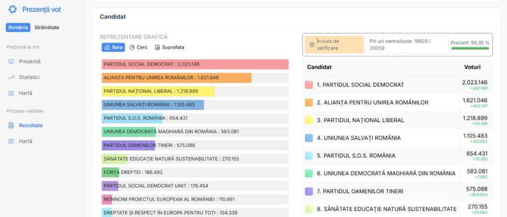 Pe locul al doilea se situează Alianţa pentru Unirea Românilor cu 18,14%, iar pe locul al treilea Partidul Naţional Liberal, cu 14,43%.