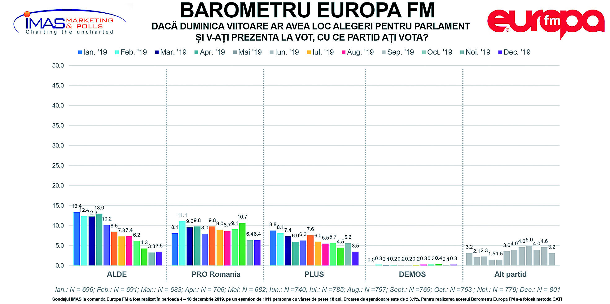 Dacă UDMR se situează constant în jurul cifrei de 5%, în schimb, se observă, în continuare, prăbușirea ALDE, dar și impotența PLUS de a capta electorat. Partidele foștilor premieri Tăriceanu și Cioloș sunt cotate ambele la câte 3,5%. Aceasta după ce ALDE era evaluat la 13,4% în decembrie 2018, iar PLUS la 8,8%. De atunci, însă, ambele sunt pe tobogan. PMP, partidul fostului președinte Băsescu nu reușească să atingă 5%, fiind cotat cu 3,5% din preferințele alegătorilor. Având în vedere dezvăluirile privind colaborarea lui Băsescu alias “Petrov” cu fosta Securitate, slaba aderență PMP la electori nu pare surprinzătoare.Sondajul IMAS la comanda Europa FM a fost realizat în perioada 4 – 18 decembrie 2019, pe un eșantion de 1011 persoane cu vârste de peste 18 ani. Eroarea de eșantionare este de ± 3,1%.