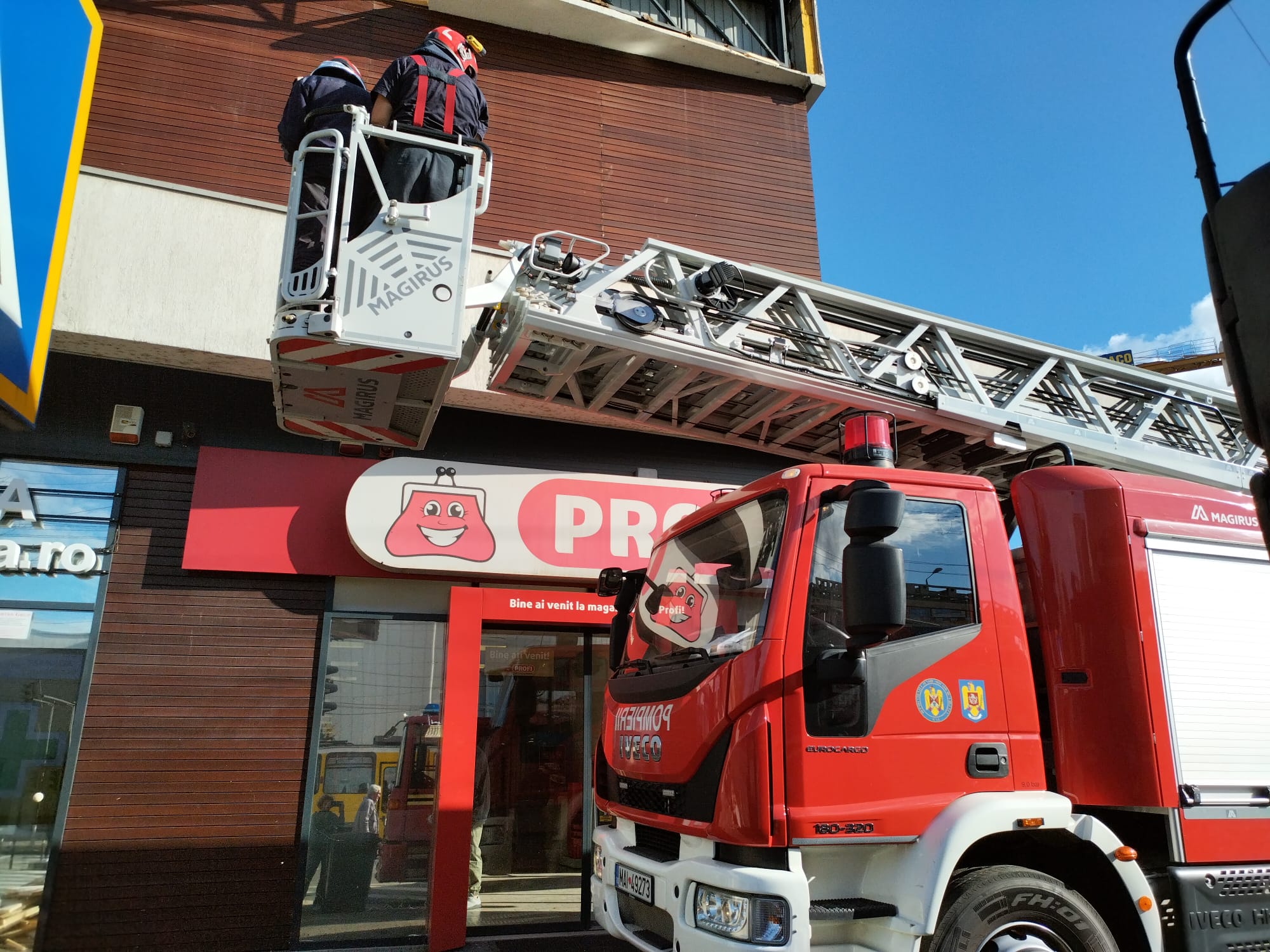 Pe trotuarul din fața magazinului, accesul pietonilor a fost restricționat, in rațiuni de siguranță s-a asigurat un perimetru de lucru pentru intervenție.