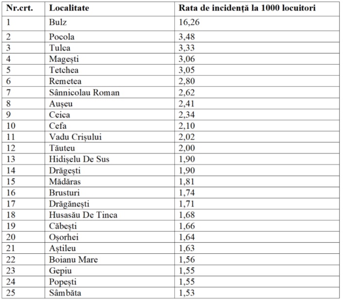 Localitățile vizate, în care incidența cazurilor confirmate pozitiv cu Covid-19, în ultimele 14 zile, depășește 1,5 cazuri/1.000 de locuitori, sunt: