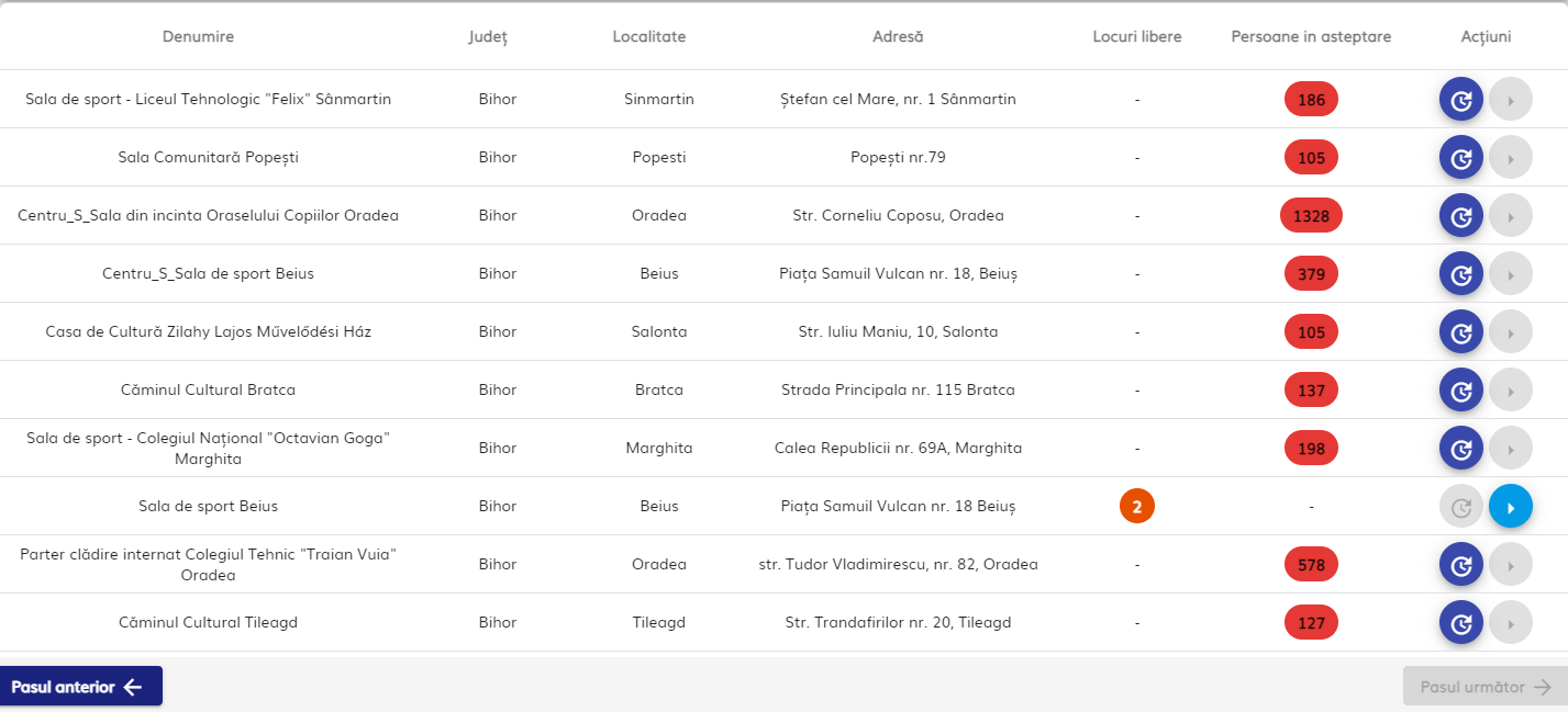 Miercuri dimineața, doar 2 locuri mai erau disponibile la Sala de Sport din Beiuș. În schimb, pe listele de așteptare s-au înscris peste 11.000 bihoreni. Mai mult de jumătate dintre acestea sunt în așteptare la trei centre din Oradea: cele două de la Orășelul Copiilor și la centrul de la Spitalul Pelican.