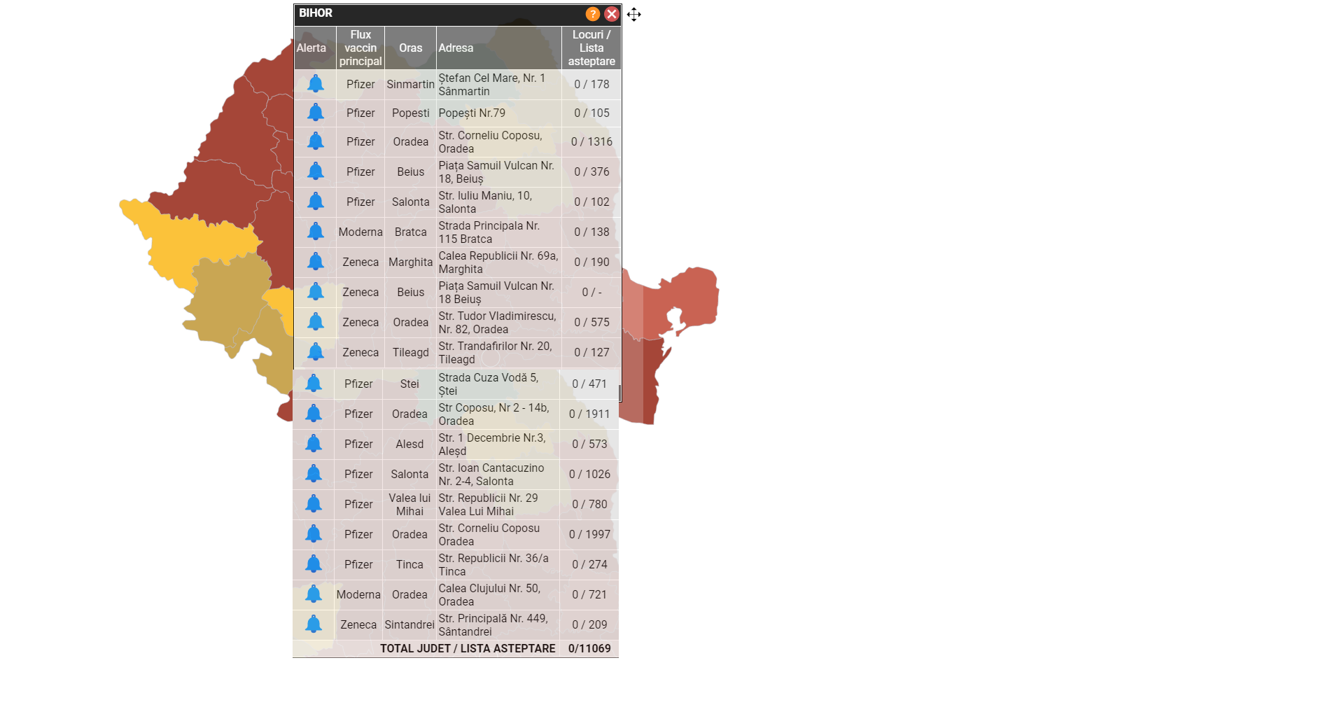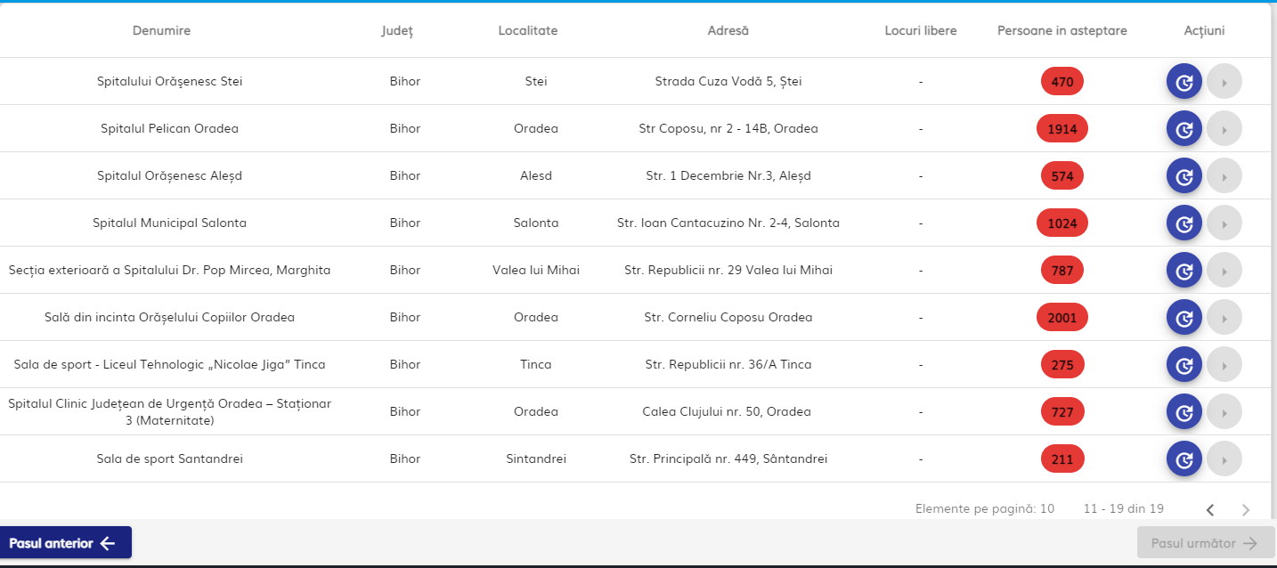 În prezent, pe platforma de programări sunt disponibile 19 centre de vaccinare situate în județul Bihor. Cinci dintre acestea sunt deschise în Oradea.