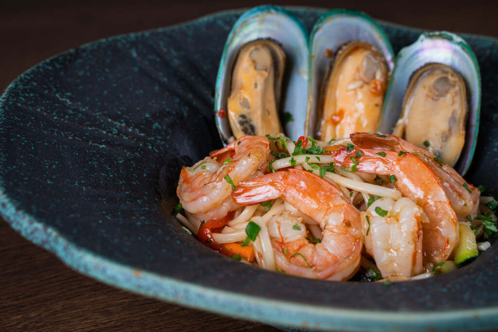 Noodles din grâu cu creveți, scoici și legume proaspete
