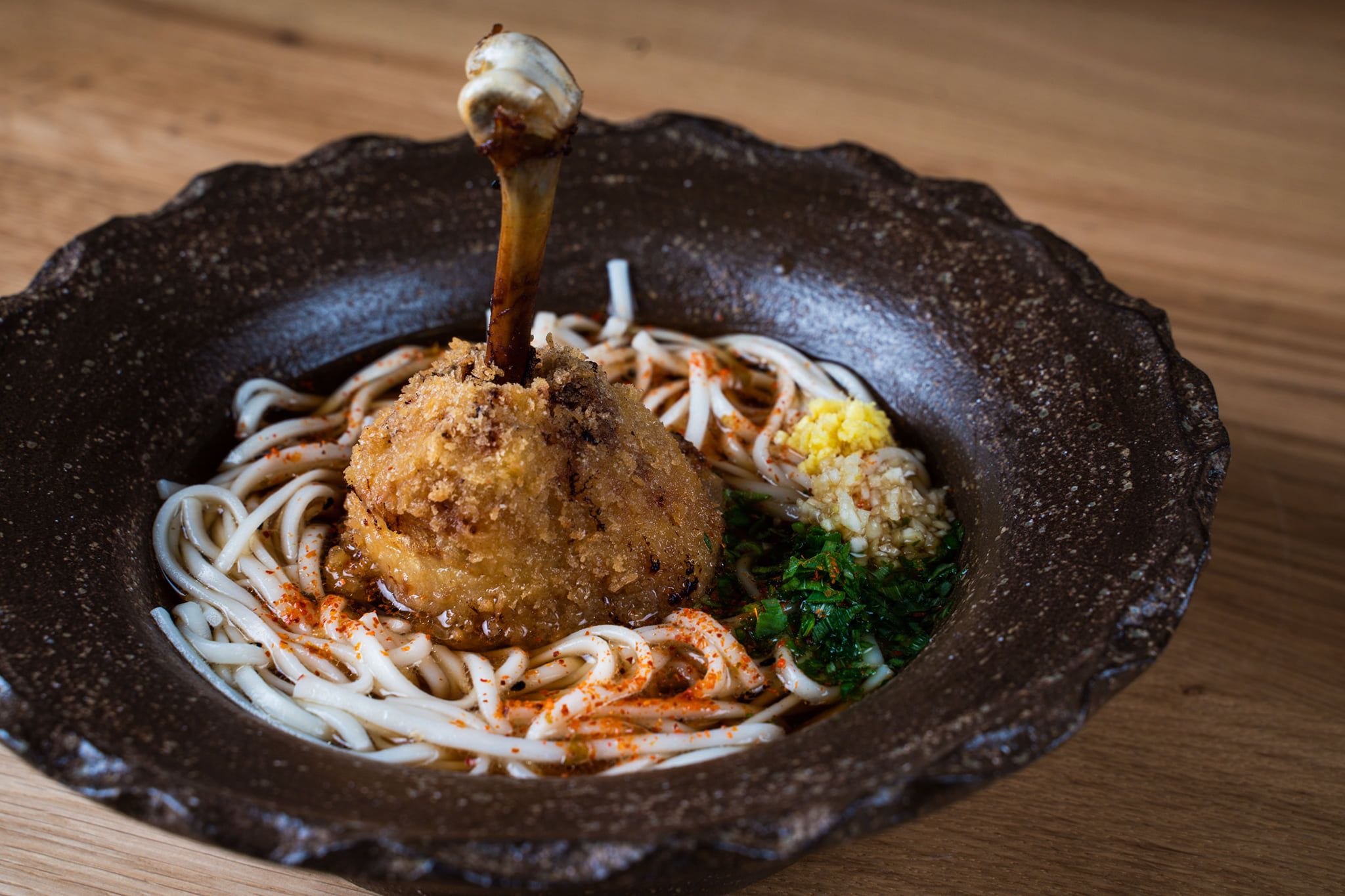 Karaage Udon cu pui tempura, bază de Ramen noodles din grâu, verdețuri proaspete și ghimbir (unic pe România)