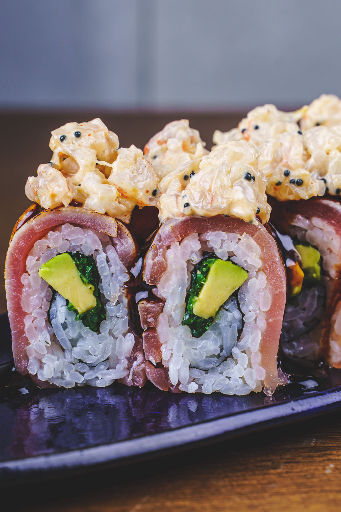 Big Fuji, ton flambat, salată wakame, avocado acoperit cu un tartar din creveți tigru, maioneză japoneză, sos kimci, ulei de trufe și icre negre