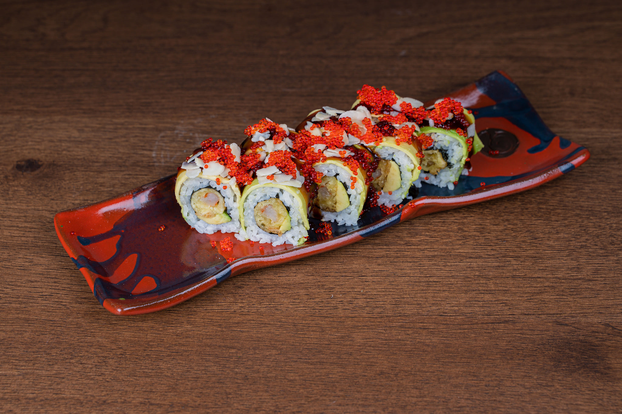 Miyagi, rolă cu creveți tigru tempura, avocado, migdale, icre roșii și sos unaghi