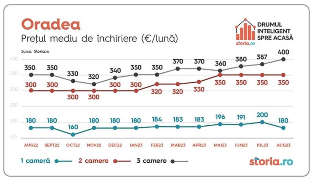 În Oradea, comparativ cu luna iulie, prețurile medii solicitate în luna august a.c. pentru închiriere au scăzut cu 10% la garsoniere, dar au crescut cu 3% la apartamentele cu trei camere, în timp ce prețurile apartamentelor cu două camere au rămas constante. Comparativ cu luna august a anului trecut, prețurile medii solicitate au crescut cu 14% în cazul apartamentelor cu trei camere și cu 17% în cazul apartamentelor cu două camere, în timp ce prețul garsonierelor a rămas constant.