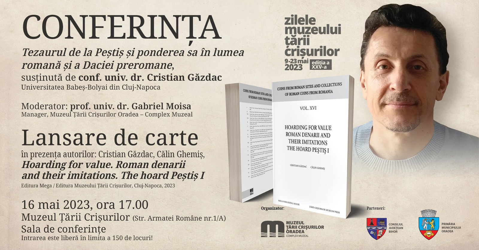 De la ora 17:00, va avea loc conferința „Tezaurul de la Peștiș și ponderea sa în lumea romană și a Daciei preromane”, susținută de conf. univ. dr. Cristian Găzdac, Universitatea Babeș-Bolyai din Cluj-Napoca, moderator fiind prof. univ. dr. Gabriel Moisa. Evenimentul va fi urmat de la ora 18:00 de lansarea cărții „Hoarding for value roman denarii and their imitations the hoard Pestis I”, în prezența autorilor Cristian Găzdac și Călin Ghemiș, care vor prezenta cartea apărută la Editura Mega /Editura Muzeului Țării Crișurilor, Cluj-Napoca, 2023. Evenimentul se va desfăşura tot în Sala de conferințe a instituţiei muzeale.