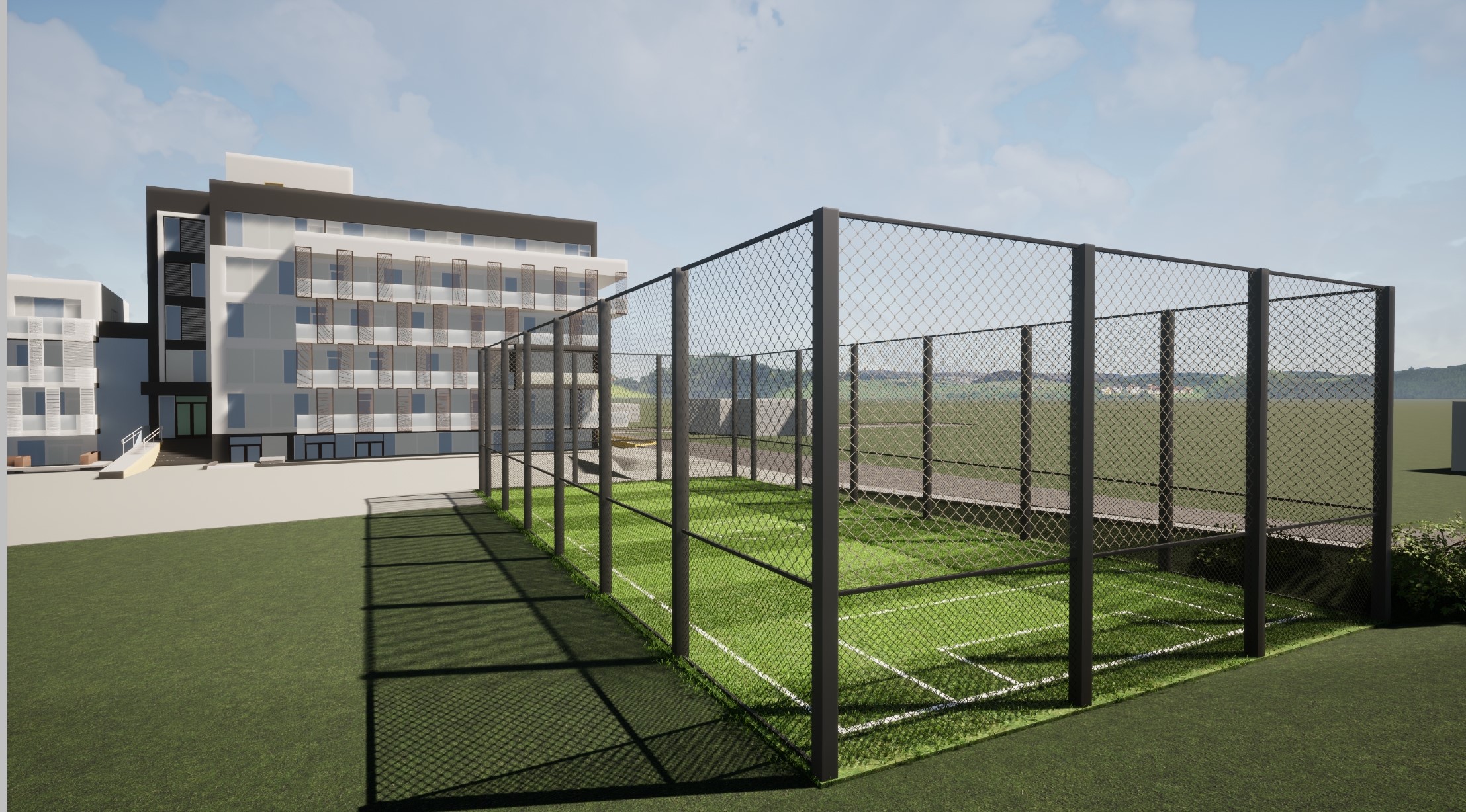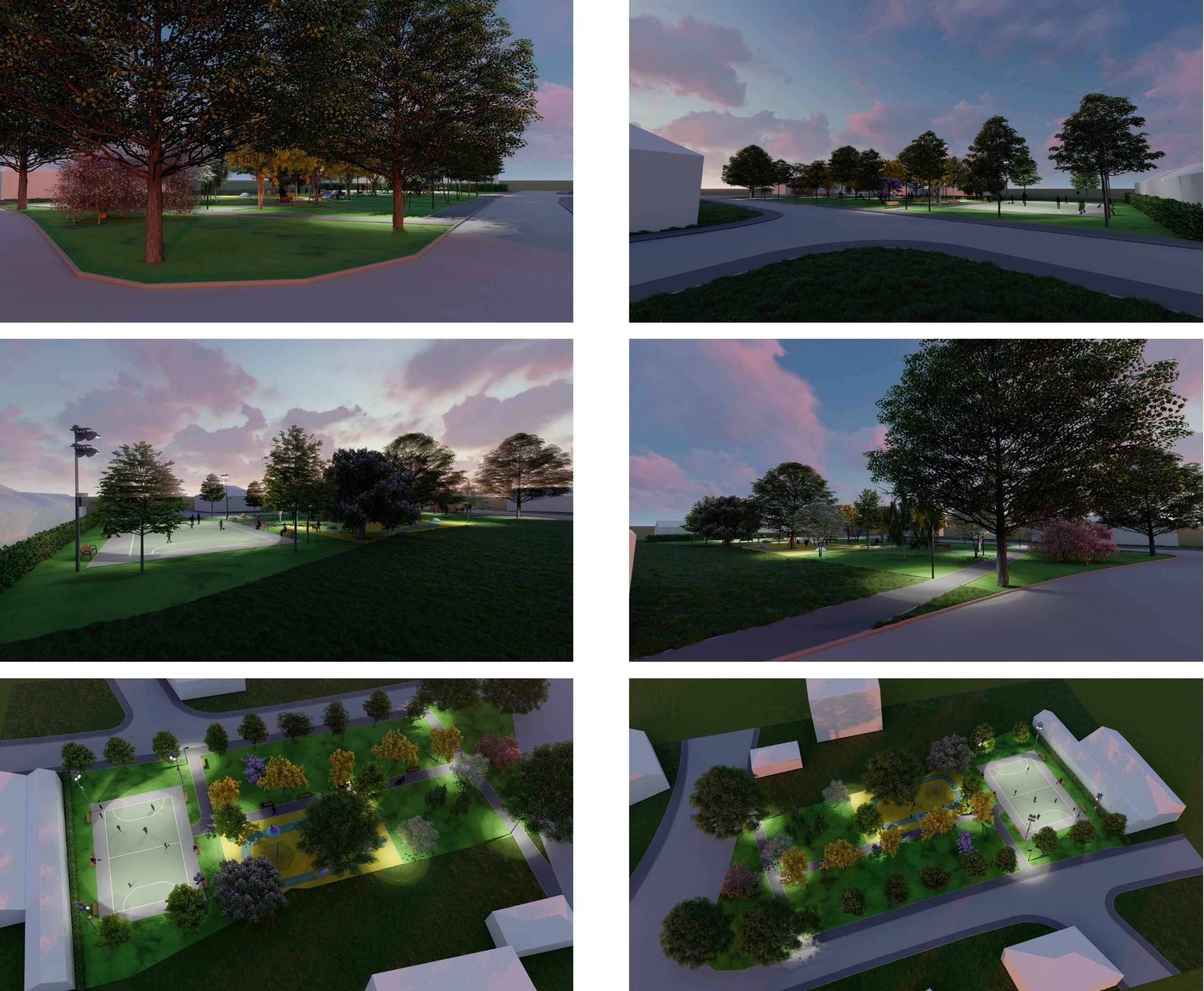 Cât privește zonele active, acestea se vor desfășura pe aproximativ 720 mp și vor fi amenajate cu tartan. Ele sunt reprezentate de locul de joacă și de terenul de sport multifuncțional, fiind separate de zone verzi plantate cu diverși arbori.