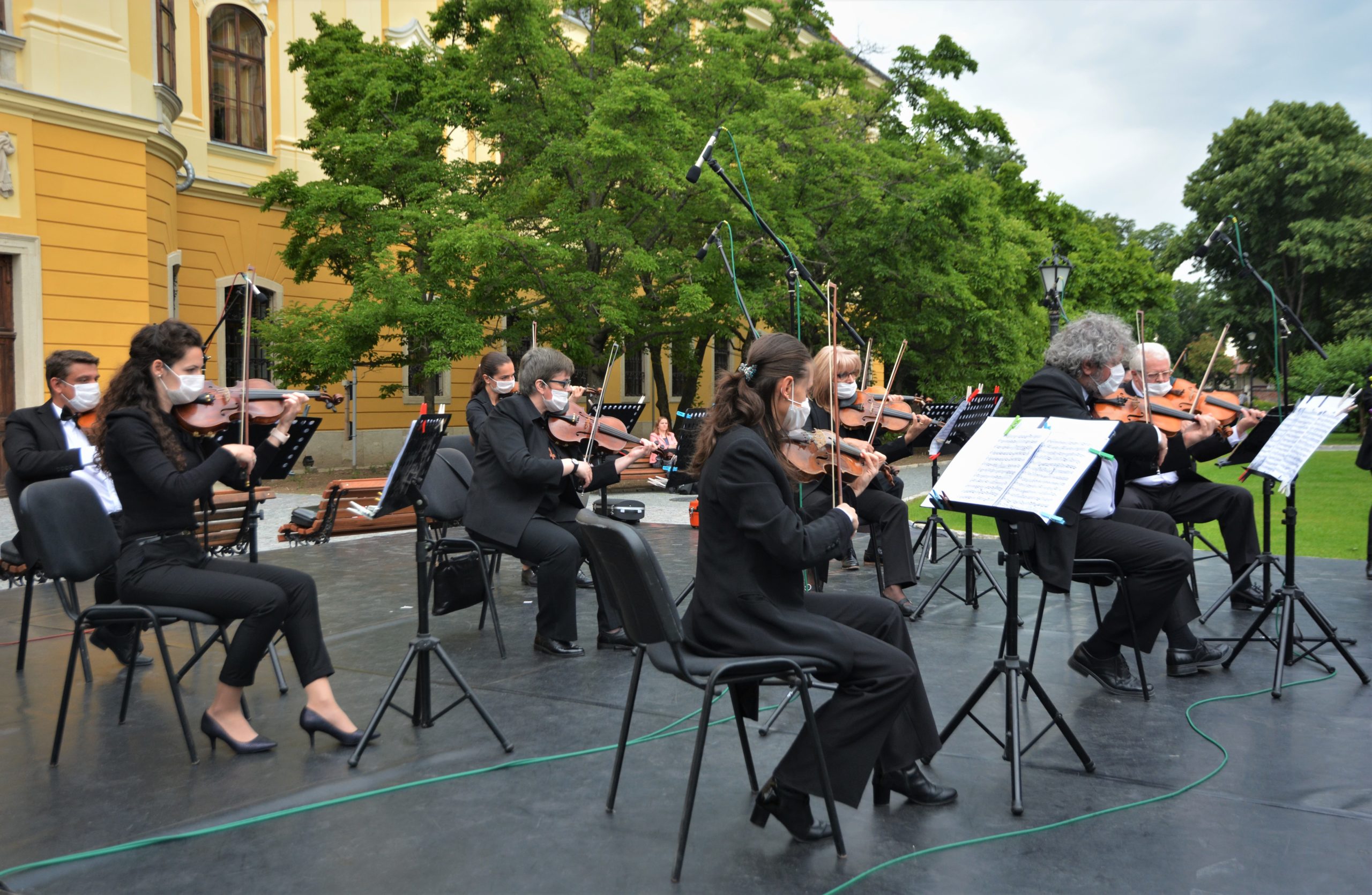 Ploaia a ocolit curtea Episcopiei Romano – Catolice vineri seara când, spre bucuria melomanilor orădeni, a avut loc concertul în aer liber susținut de formația Camerata Michael Haydn. Aşa cum a spus înainte de începerea concertului directorul Filarmonicii de Stat Oradea, Meleg Vilmos, după lunile de pauză forţată, primul eveniment în aer liber s-a dorit a fi dedicat în primul rând abonaţilor, care au fost văduviţi în această perioadă de obişnuitele concerte. În curtea Episcopiei au fost pregătite, într-un spaţiu delimitat, scaune pentru 140 de persoane. Evenimentul a fost organizat cu respectarea măsurilor și regulilor precizate pe perioada stării de alertă, pentru prevenirea răspândirii virusului COVID 19.