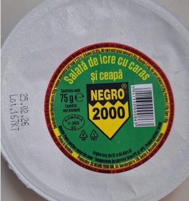 SC Negro 2000 SRL a anunțat rechemarea de pe piață a produsului „Salată de icre cu caras și ceapă“, ambalat la 75 de grame, ca urmare a depistării bacteriei Listeria monocytogenes. Produsul vizat aparține lotului 167KT, cu data expirării 25.02.2026.