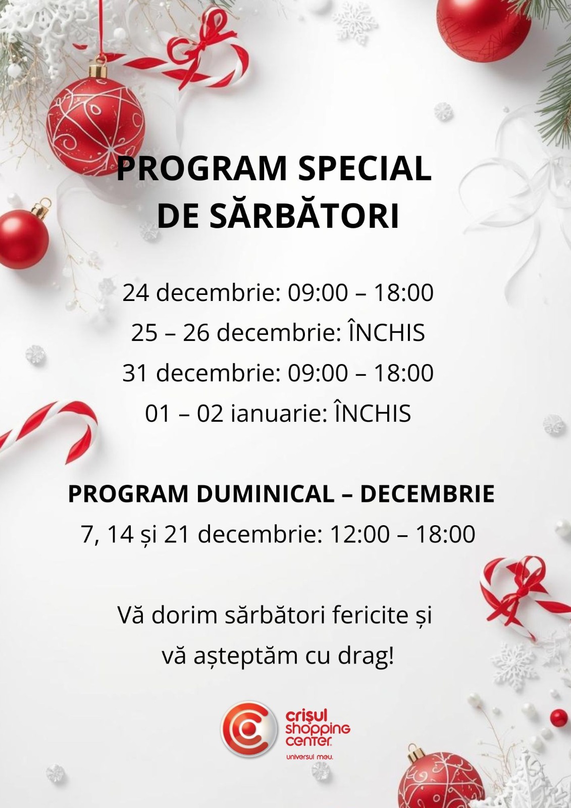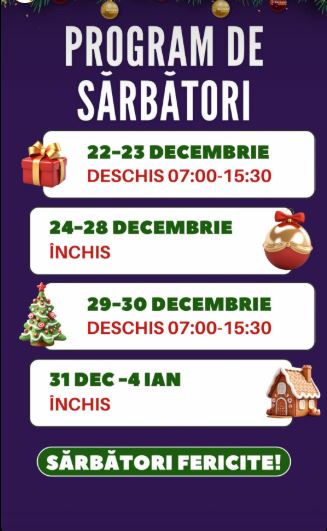 - 26 decembrie: 09:00 – 17:00 (program scurt)