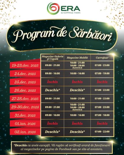 - 26 decembrie: 10:00 – 22:00 (Majoritatea locațiilor revin la program aproape complet)