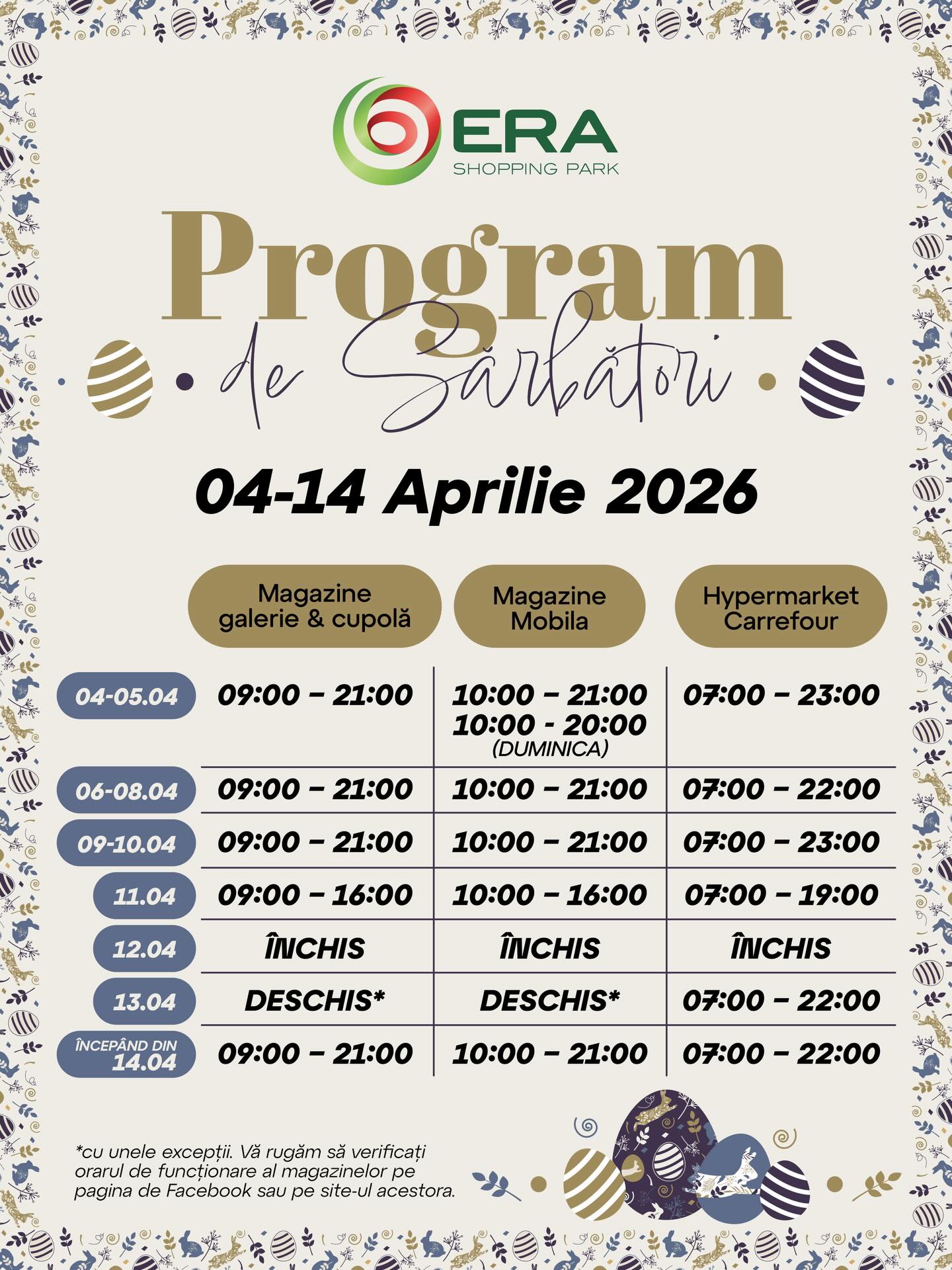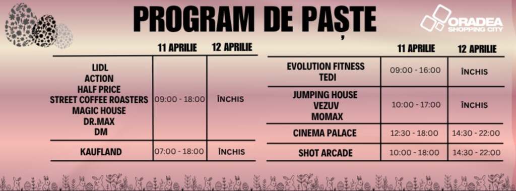 - sâmbătă, 11 aprilie –program redus, cu închidere în jurul orei 19:00