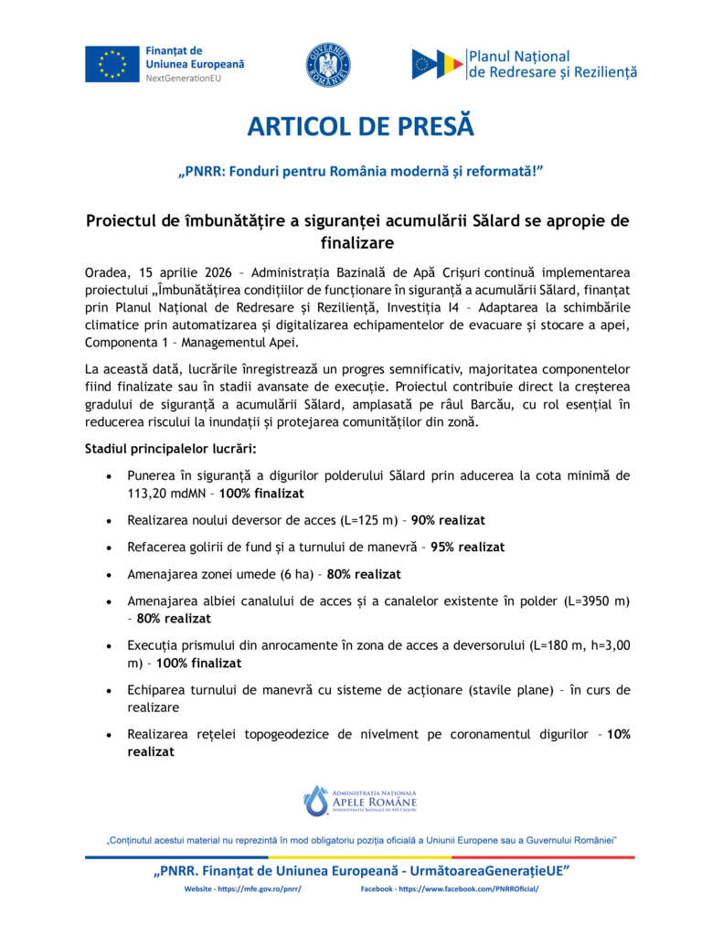 Oradea, 15 aprilie 2026 – Administrația Bazinală de Apă Crișuri continuă implementarea proiectului „Îmbunătățirea condițiilor de funcționare în siguranță a acumulării Sălard, finanțat prin Planul Național de Redresare și Reziliență, Investiția I4 – Adaptarea la schimbările climatice prin automatizarea și digitalizarea echipamentelor de evacuare și stocare a apei, Componenta 1 – Managementul Apei.