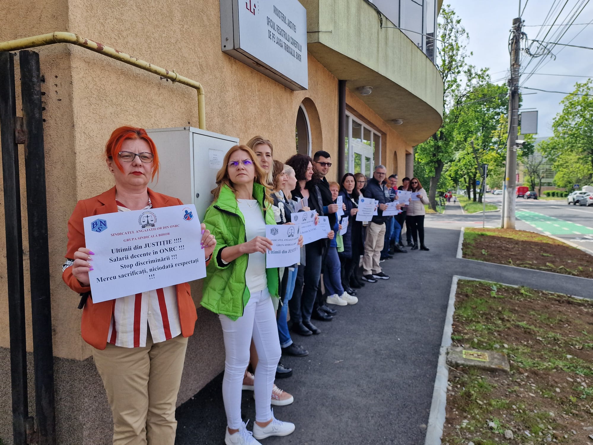 „Ultimii din justiție!“, „Salarii decente în ONRC!“, „Stop discriminării!“ sau „Mereu sacrificați, niciodată respectați!“ sunt mesajele pe care angajații le-au afișat timp de jumătate de oră. În același timp, astfel de acțiuni au avut loc și în Brașov, Constanța sau Satu Mare.