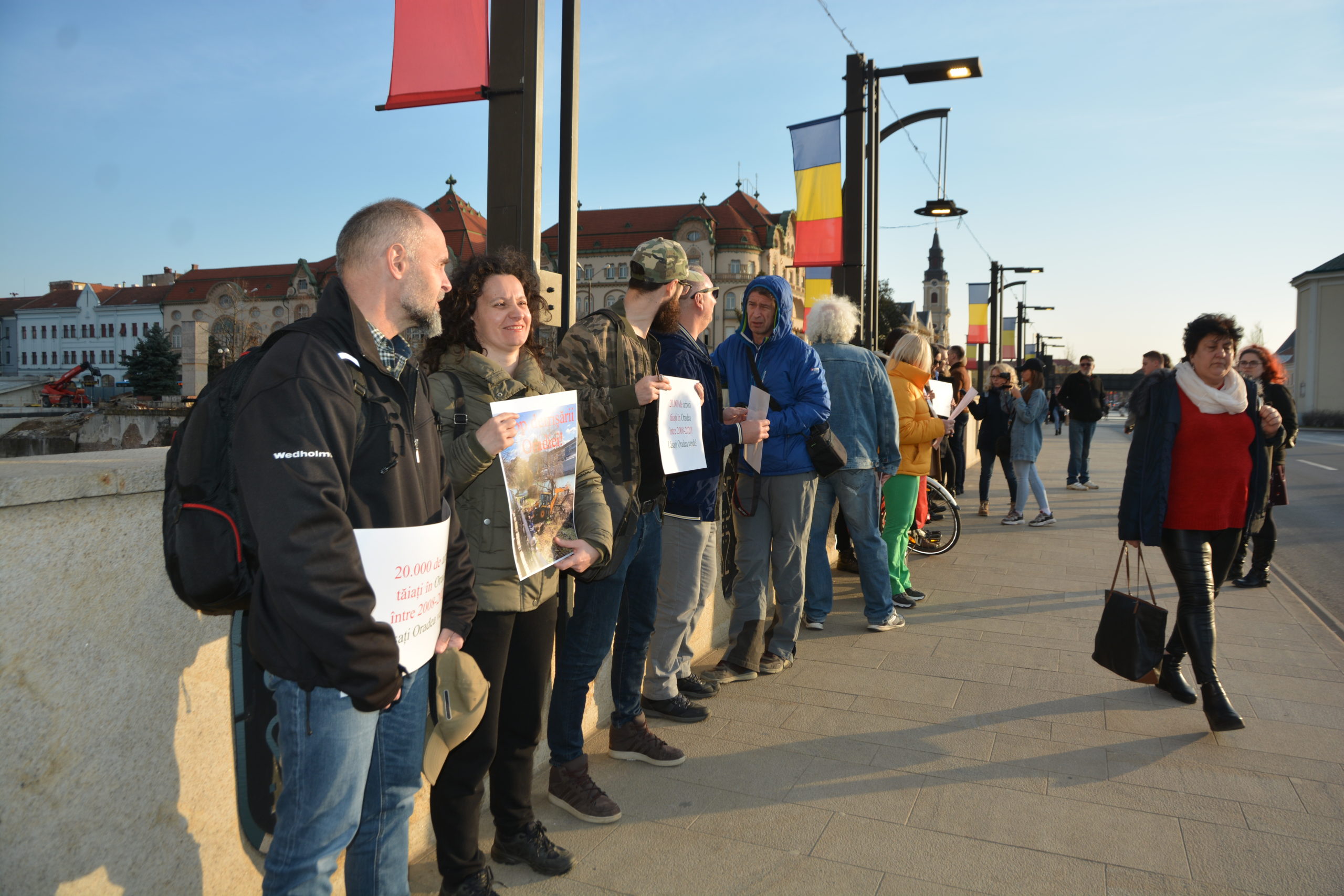 Prostestul a început marţi la ora 17:00 şi a adunat public omogen, de la orădeni de rând, vorbitori de română şi maghiară, până la politicieni mai noi sau mai vechi. Cei din USR şi PLUS, între care şi candidaţi la locale precum Vasile Dumitriu, Andrei Acs sau Marius Şovarschi au stat pe pod cu afişele primite de la Orlando Balaş, cu mesajele „20.000 de arbori tăiaţi în Oradea între 2008 şi 2020” sau „Stop defrişării Oradiei”. Spre capătul Podului Sf. Ladislau s-au grupat vârstnici PRM-işti, cei care blamau tineretul pentru că l-a votat pe Ilie Bolojan primar, ca atare tinerii sunt responsabili şi pentru defrişări.