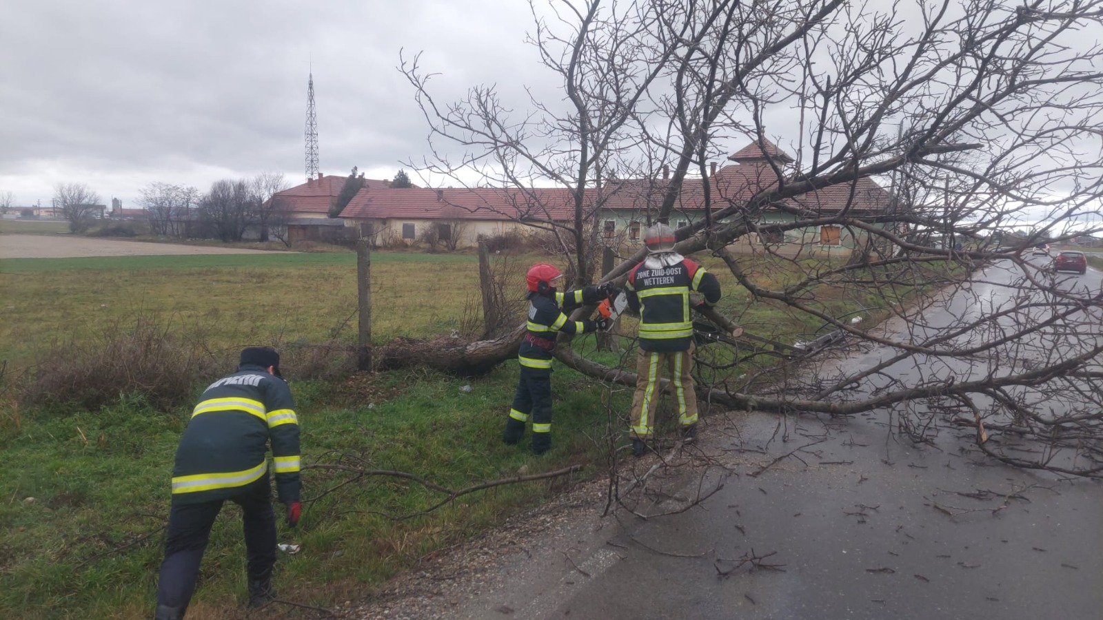 Datorită vântului puternic, o bucată de tablă din acoperișul unei case s-a desprins parțial și a fost necesară intervenția pompierilor pentru înlăturarea acesteia. În același interval orar, pompierii au fost solicitați să înlăture doi stâlpi și doi copaci care au căzut pe carosabil și pe trotuar.