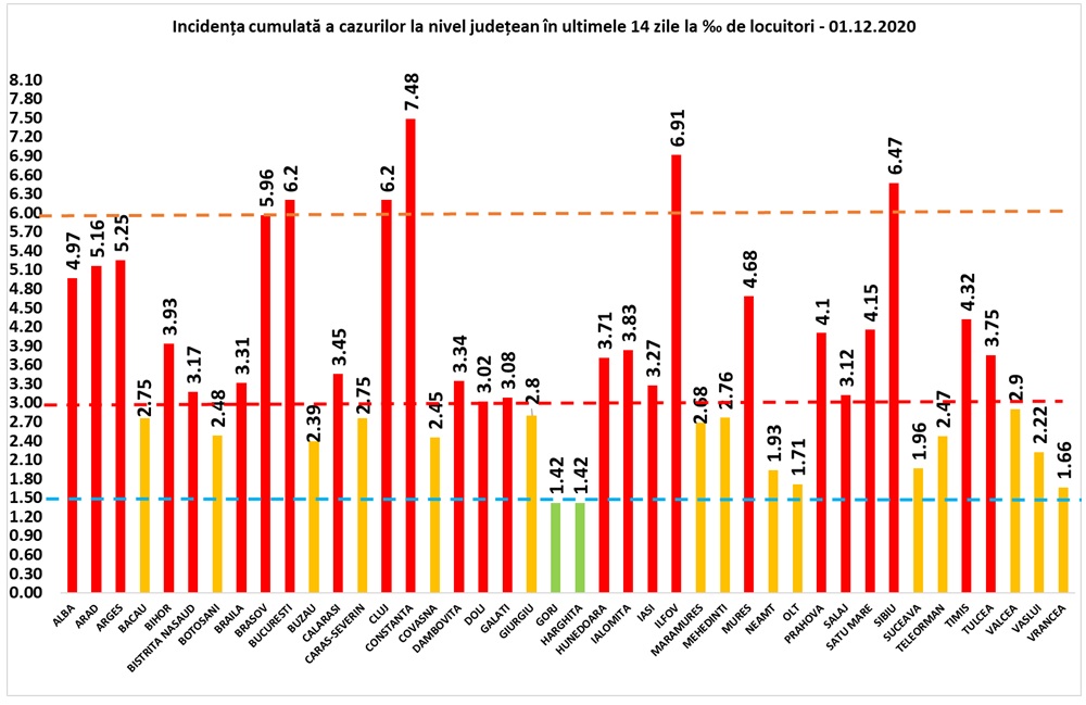 Coeficientul infectărilor cumulate la 14 zile, raportate la 1.000 de locuitori este calculat de către Direcțiile de Sănătate Publică, la nivelul Municipiului București și al județelor. Mai jos aveți graficul realizat în baza raportărilor primite de CNCCI de la Direcțiile de Sănătate Publică: