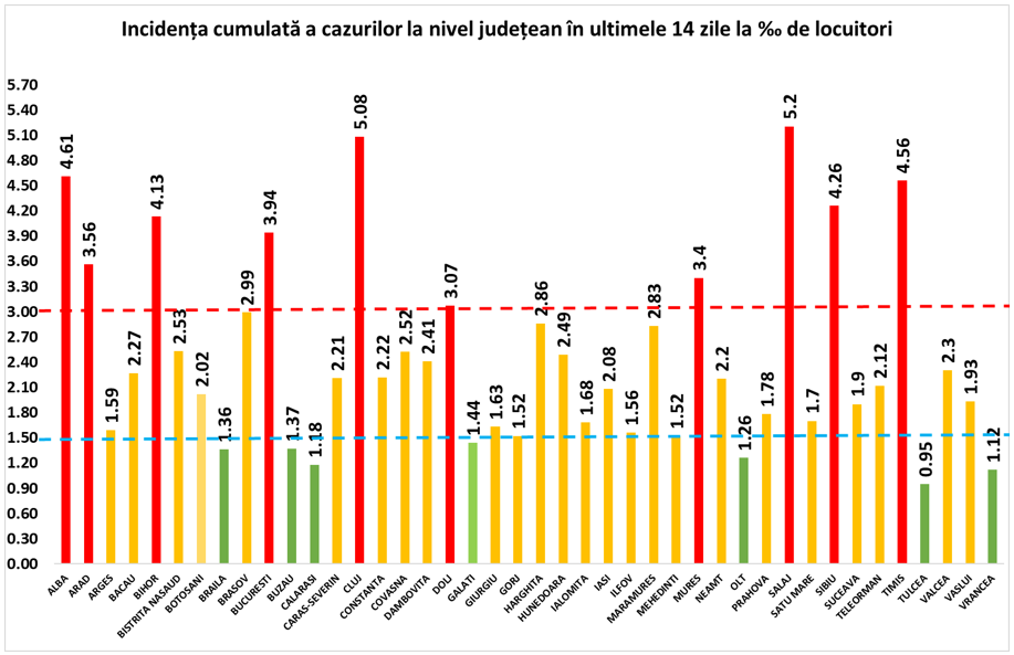 Coeficientul infectărilor cumulate la 14 zile, raportate la 1.000 de locuitori este calculat de către Direcțiile de Sănătate Publică, la nivelul Municipiului București și al județelor. Mai jos aveți graficul realizat în baza raportărilor primite de CNCCI de la Direcțiile de Sănătate Publică: