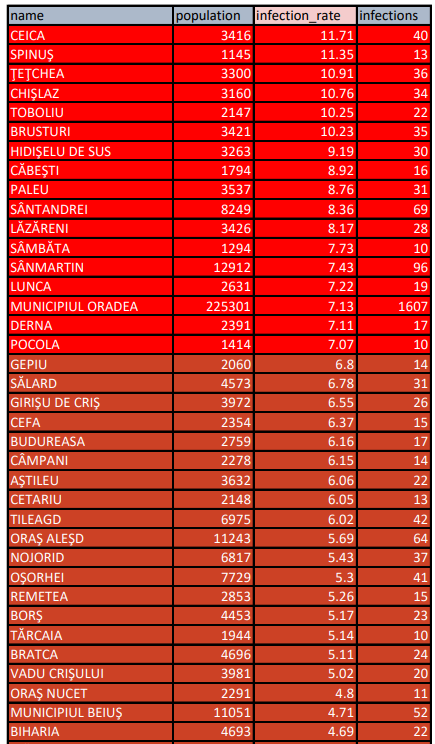 Incidențele sunt în creștere în aproape toate localitățile din Bihor. Oradea a ajuns la 7,13‰. Reamintim că la următoarea ședință a CJSU Bihor după depășirea incidenței de 7,5‰ se vor impune restricții de circulație pe timp de noapte pentru nevaccinați.