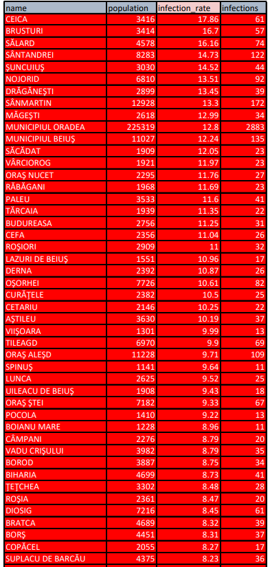 Pe tot parcursul zilei precedente au fost confirmate 505 cazuri pozitive din 2.168 de teste efectuate. Totodată, 395 de bihoreni au fost declarați vindecați, astfel că numărul cazurilor active din județ a crescut doar cu 86. Chiar și așa, la nivelul județului s-a depășit pragul de 6.000 de cazuri active. Aproape jumătate dintre ele, 2.883 sunt localizate în Oradea.